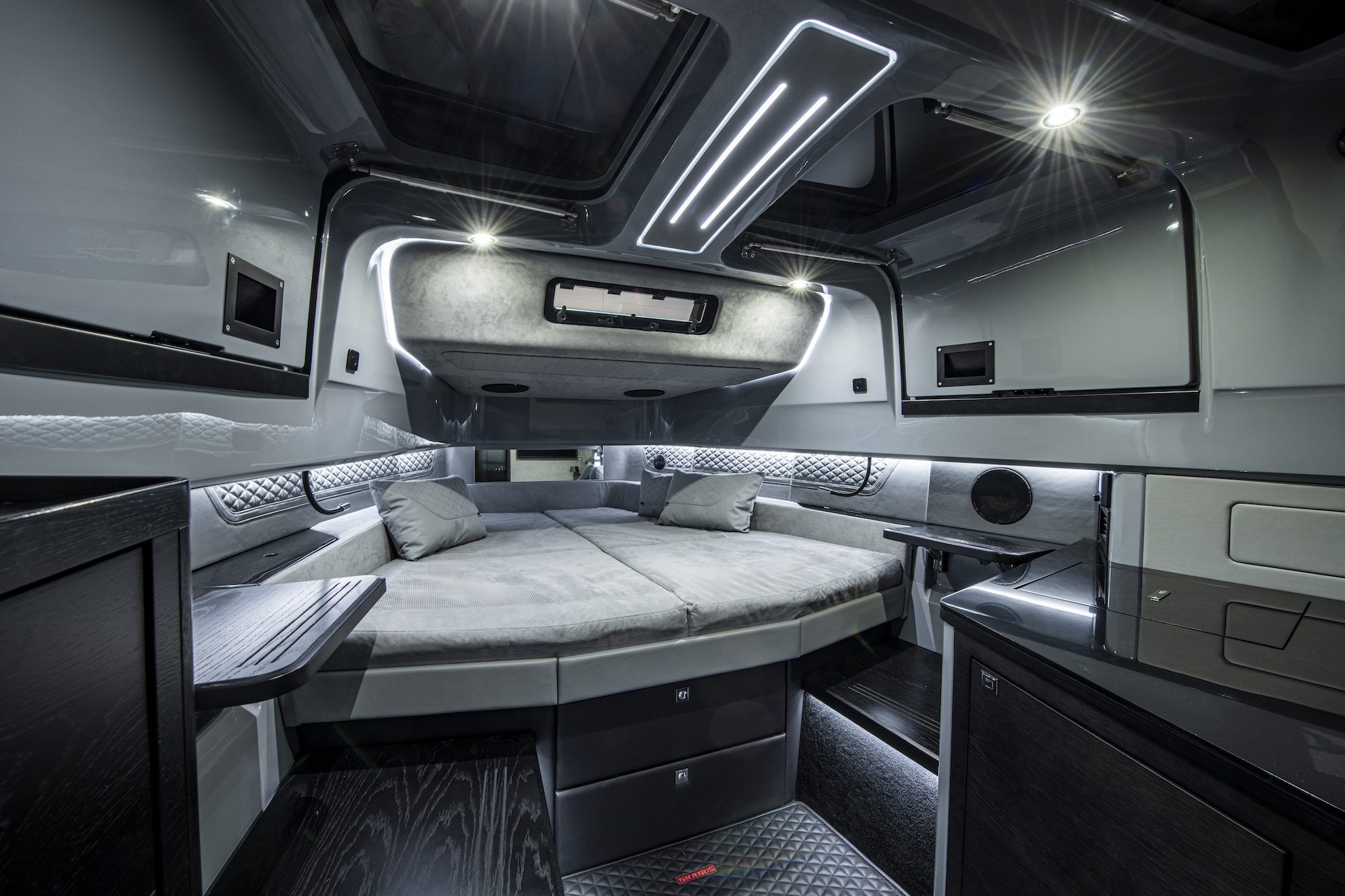 The aft cabin of the BRABUS Shadow 1200 offers a cozy retreat with its spacious bed, TV screen, and elegant finishes. With thoughtful touches such as reading lights and easy access to amenities, guests can unwind in style after a day of adventure on the water.