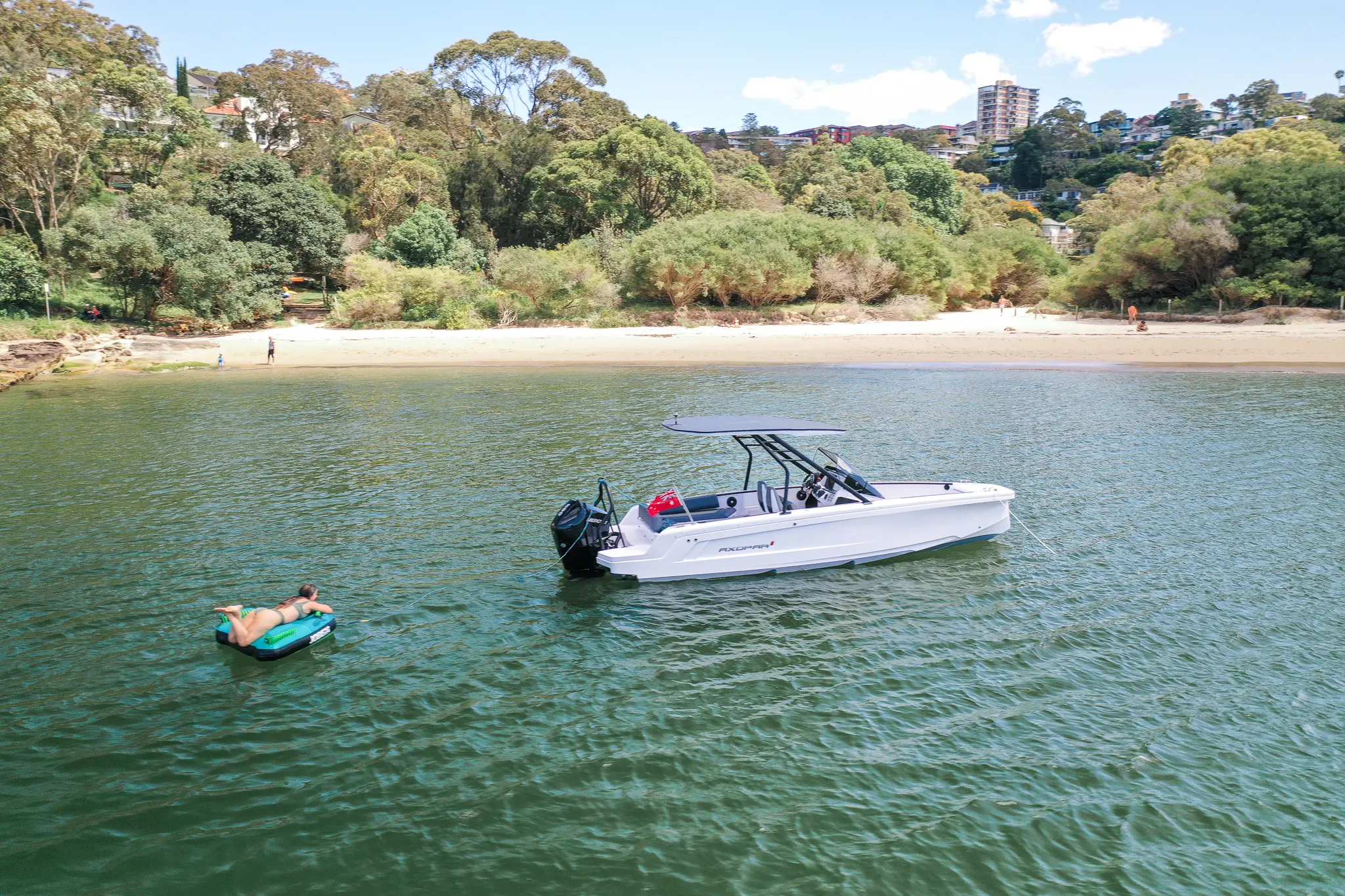 It wouldn’t be a Sydney boat day if we didn’t burn past the iconic harbour before tucking into Middle Harbours, Chinamans beach. Tossing the peak into the water, it was only fitting for the adults to “test” this new toy for themselves. Jumping on and taking a moment to relax on the inflatable, the peak got two thumbs up for its dual-purpose abilities; all that was missing was a gin and tonic.