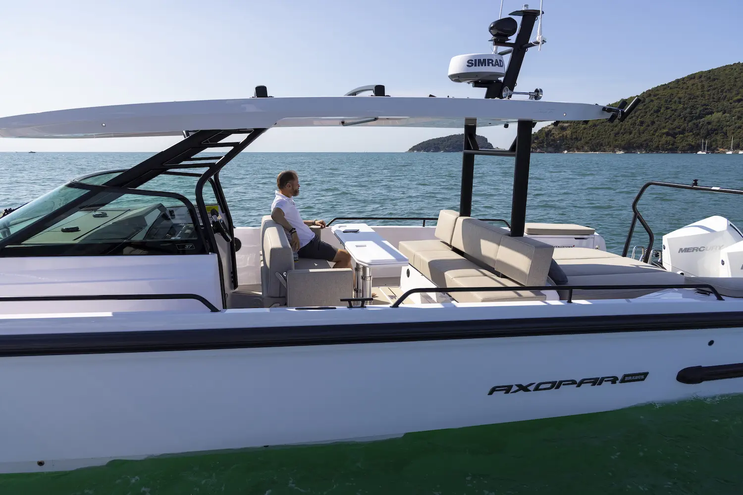 On Mediterrana Edition Axopars the cockpit will feature a plush aft sofa, and the drivers’ helm seats have been completely remodelled as a length-adjustable sofa with foldable backrest and armrests. All this is changed to further enhance functionality onboard and the feeling of open-air socializing with friends and family.