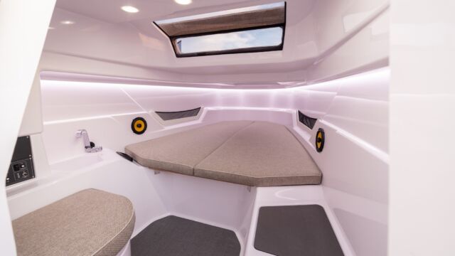 Beneath the waterline, the twin-stepped hull reduces drag and increases lift by channeling air under the boat, improving both efficiency and performance. The 25 Cross Bow planes at just 13 knots, cruises efficiently at 27 knots burning only 28L/h, and reaches speeds of up to 42 knots with a 250hp engine. With a 230L fuel capacity, this 25ft boat offers a cruising range of around 220 nautical miles, making it ideal for coastal runs, island-hopping, or chasing open-water adventures with confidence.