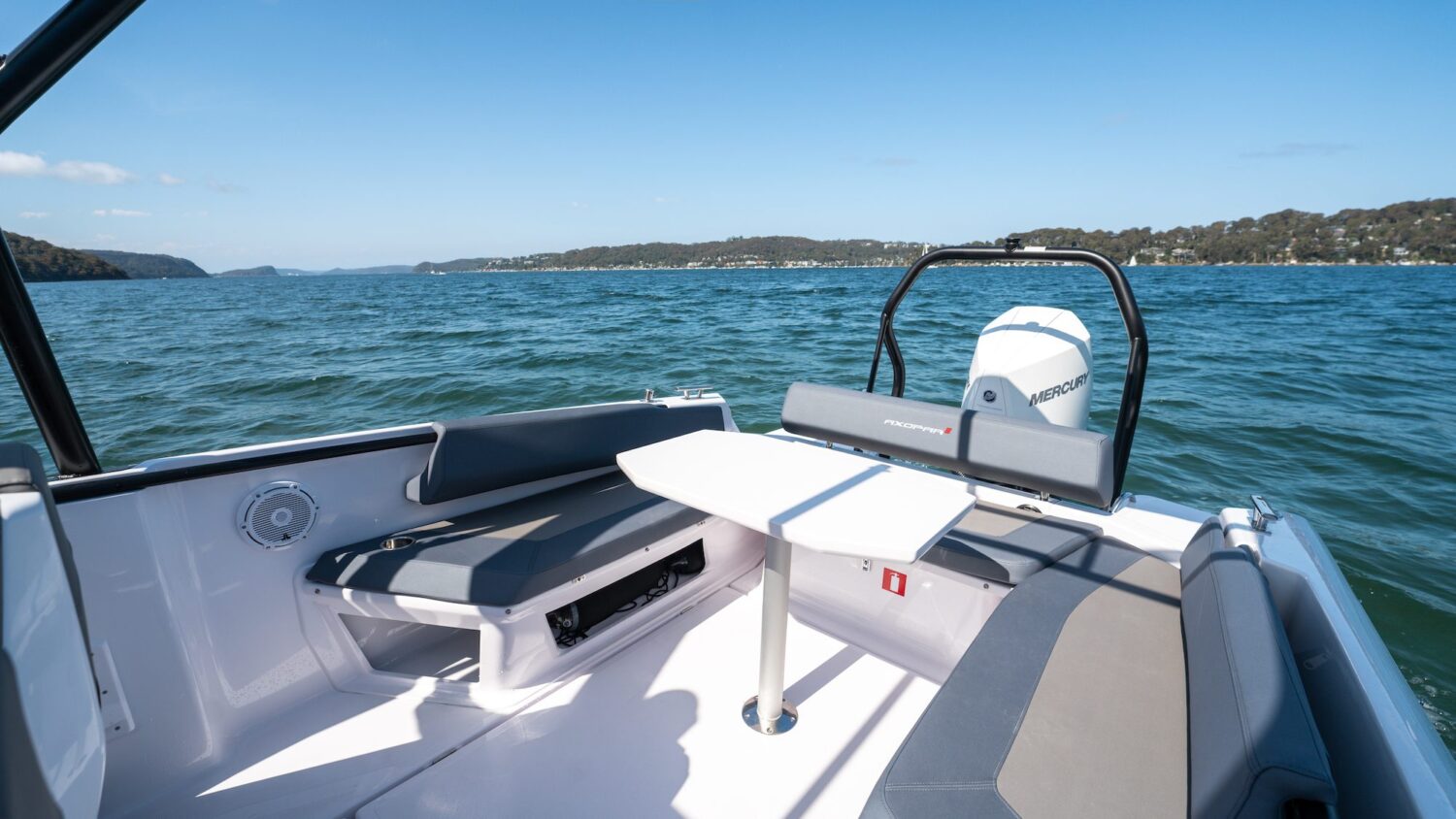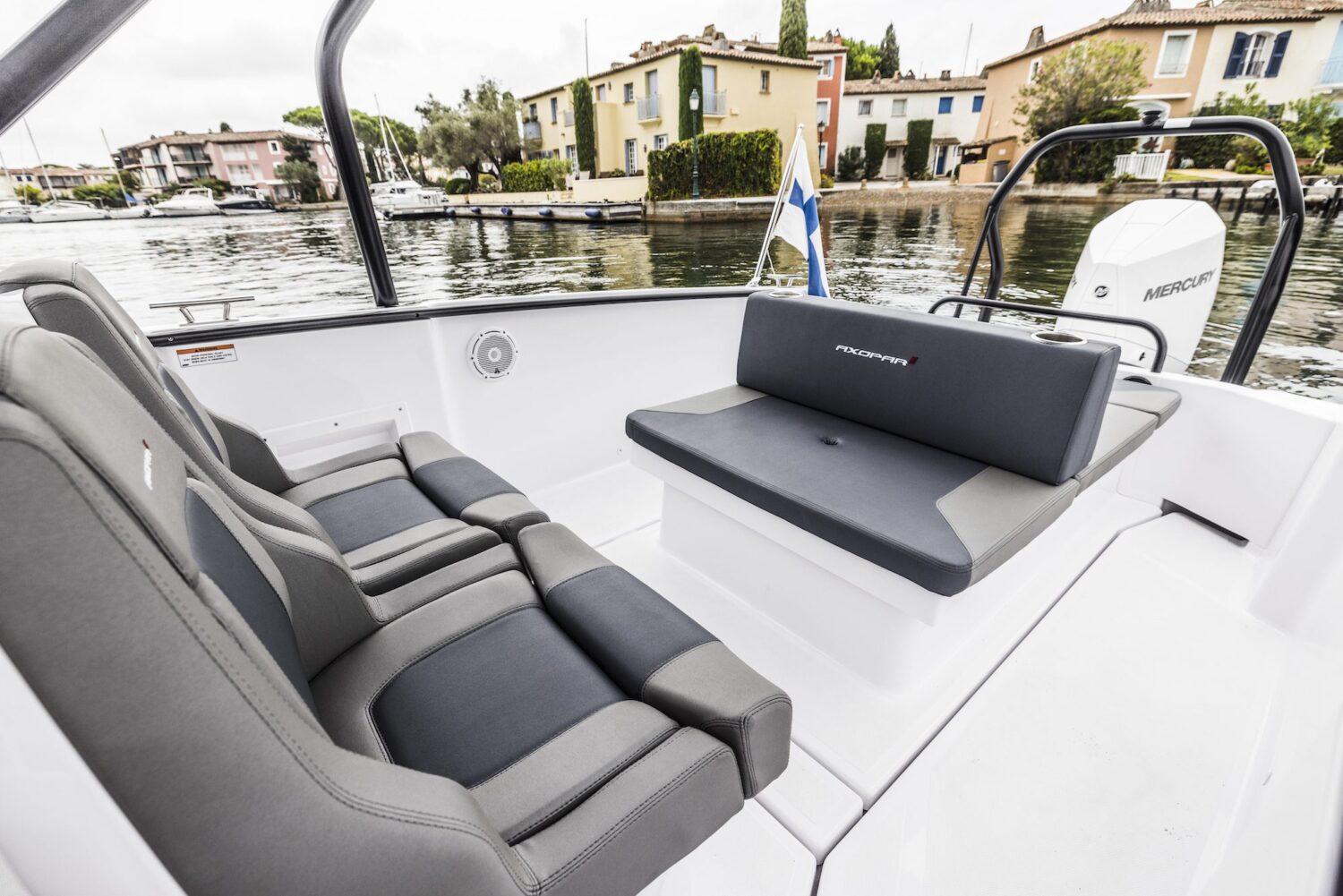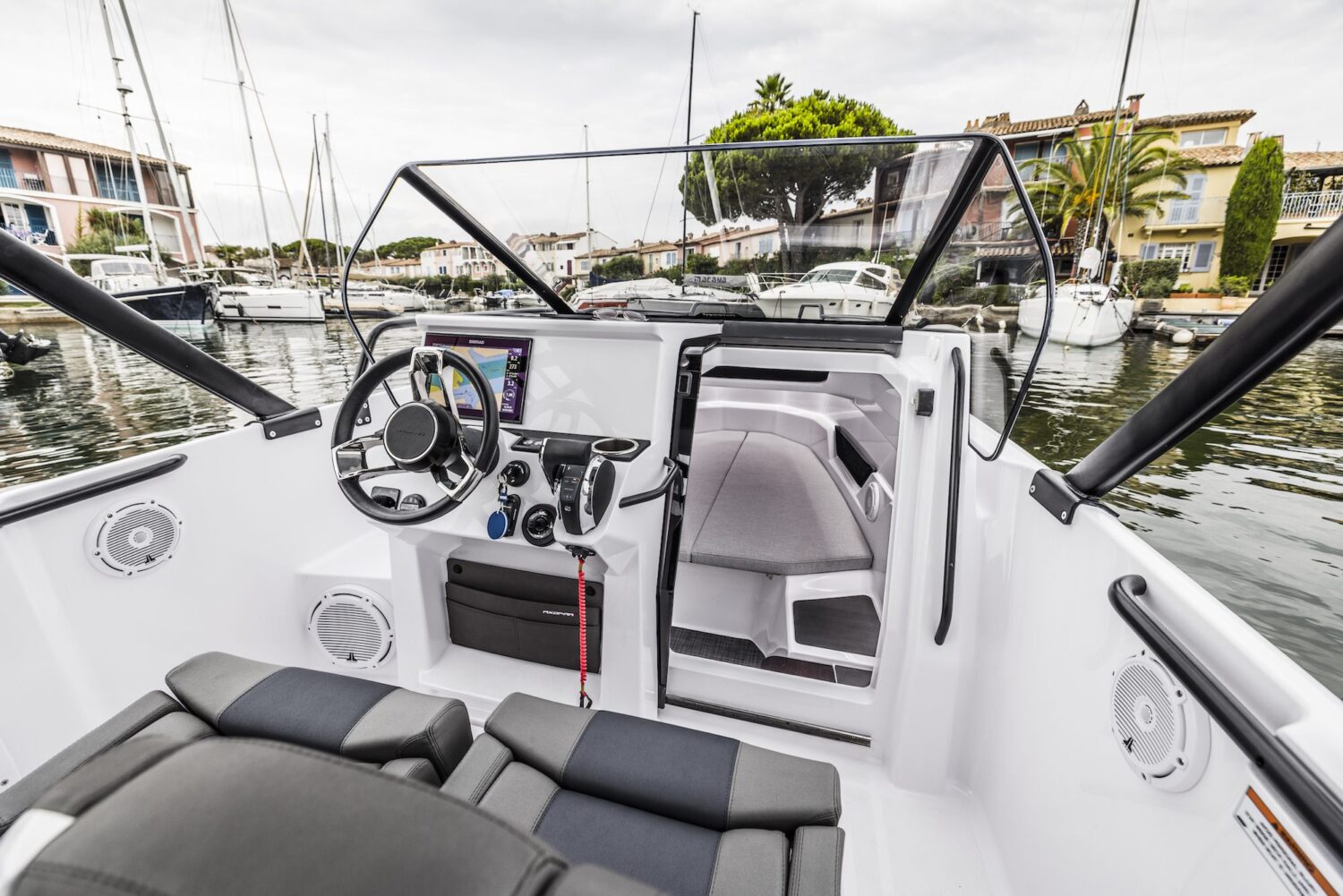 The wide helm console and front screen offer a helm seating area with more space and room for a step-through entrance to the front cabin, in a style used by other larger Axopar models.