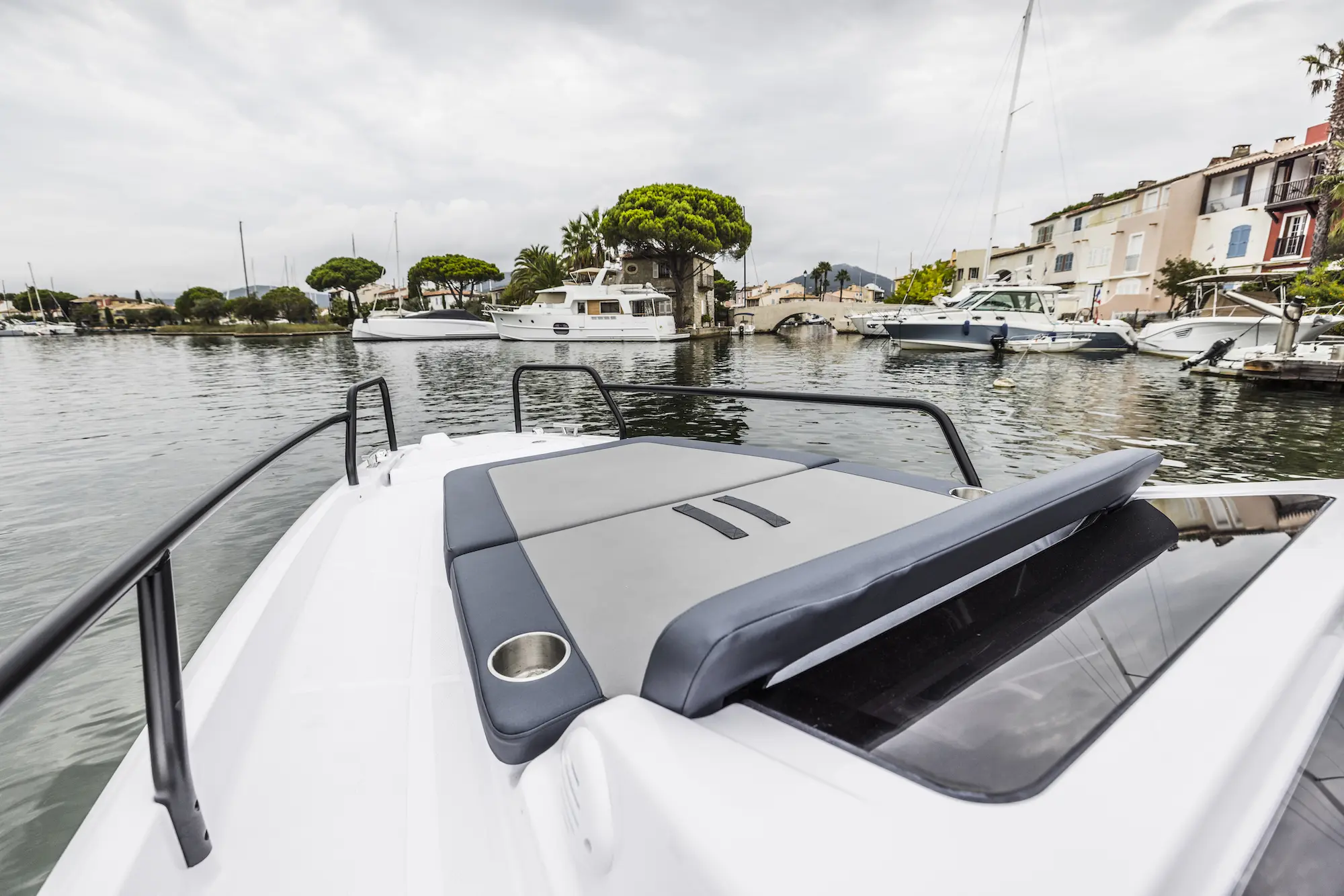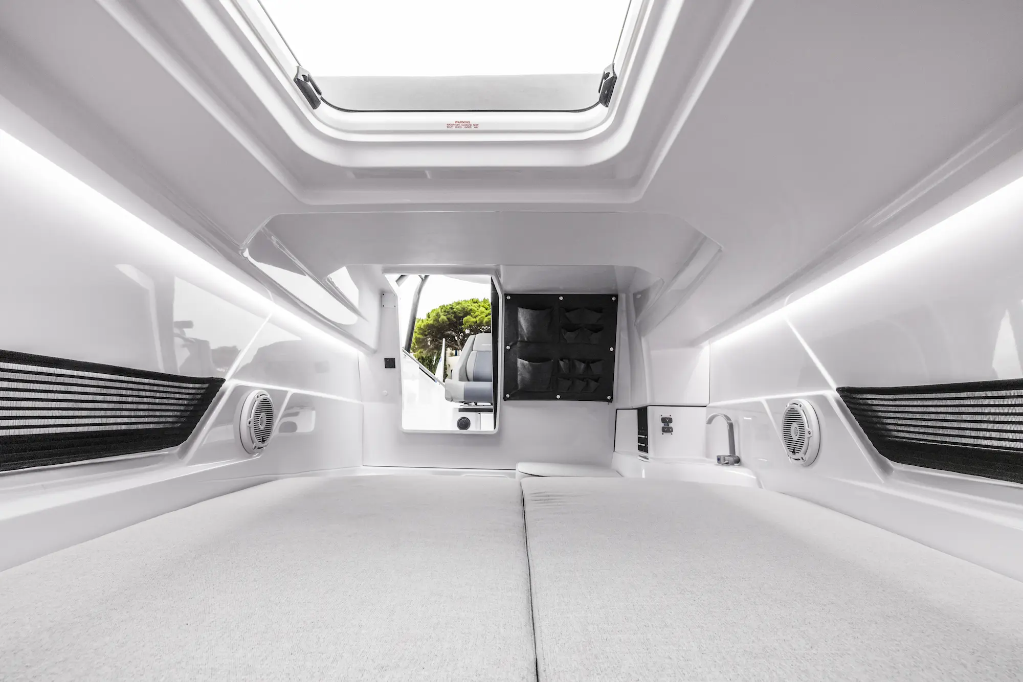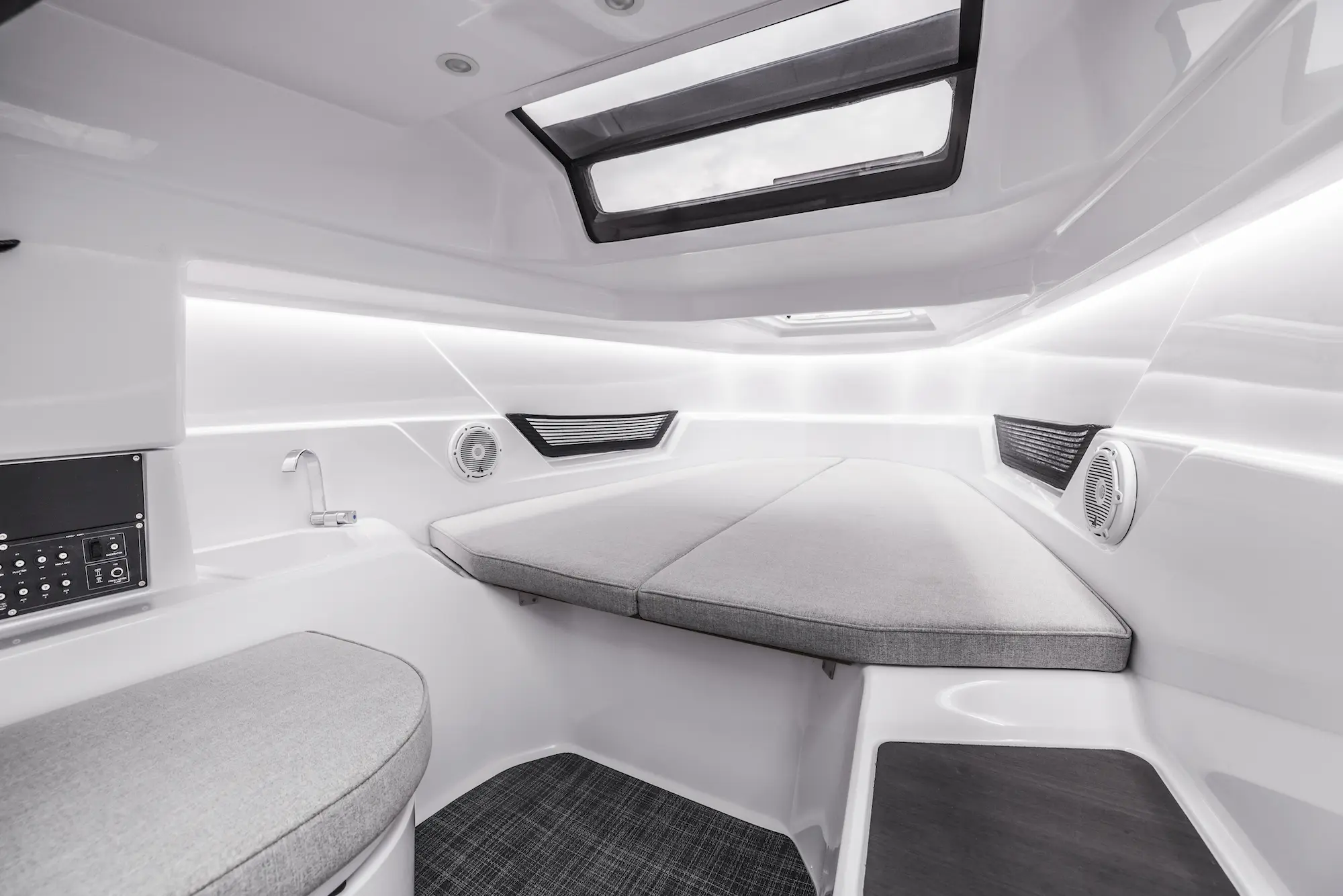 A good spread of deck seating modules and storage options will enable customers to configure the boat precisely to their every need. Three different aft deck layouts will be available at launch, including a large U-shaped sofa for six people, a multi-storage compartment with seating, or the forward-facing rear bench seat for two-people as standard.