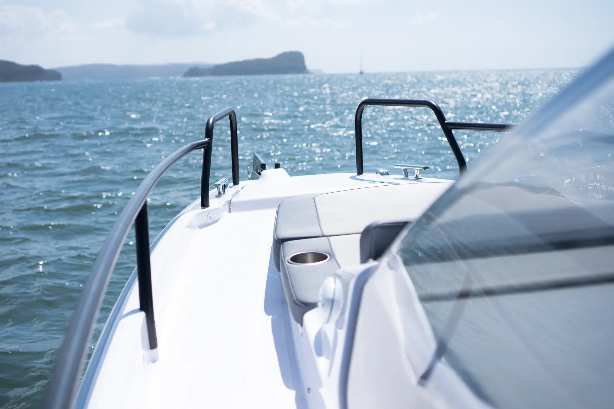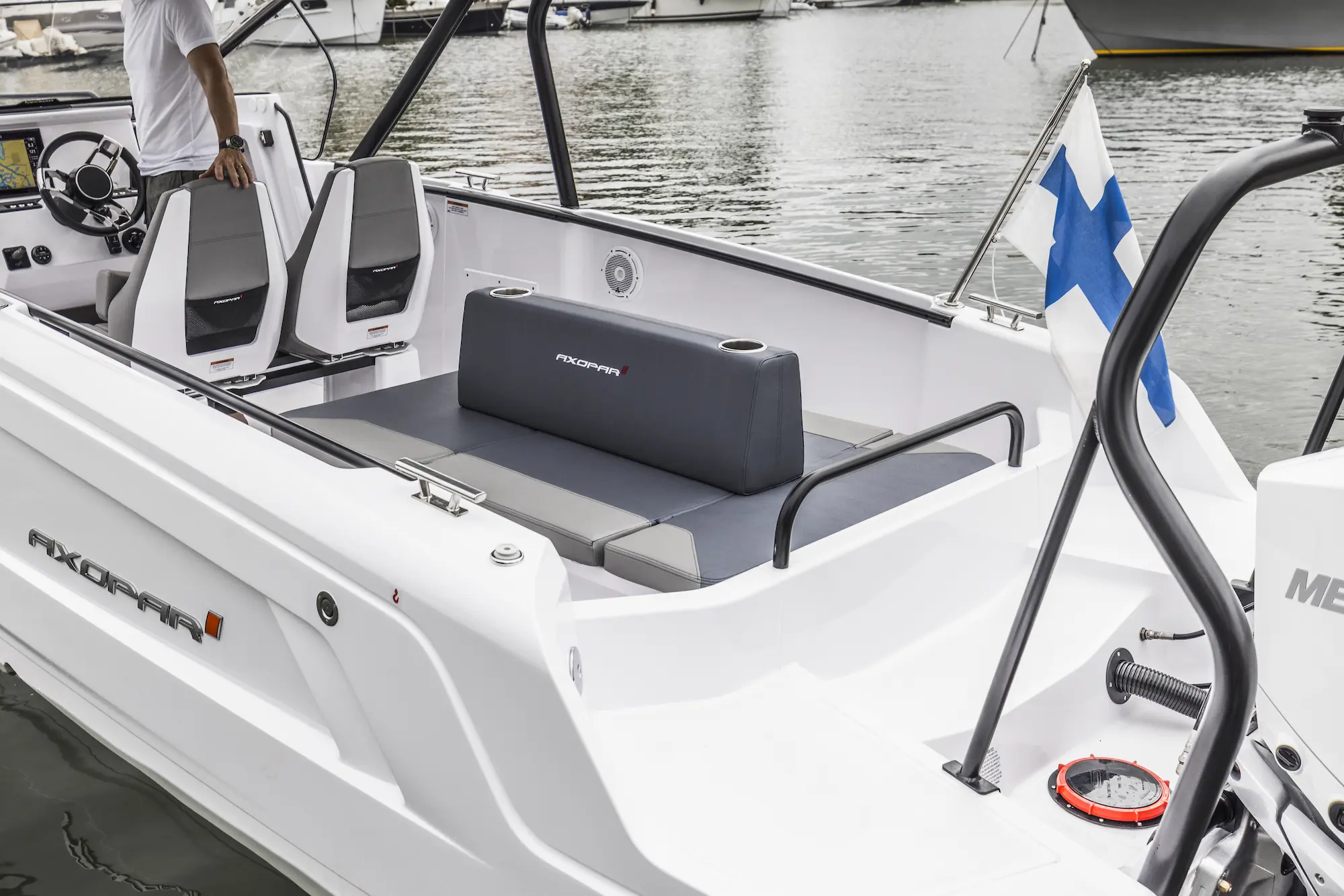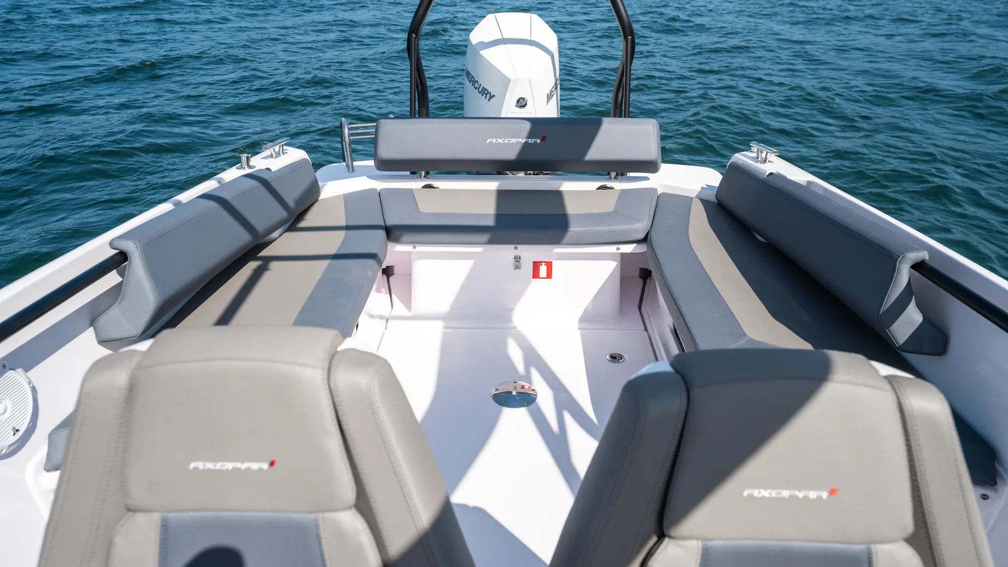 The wide helm console and front screen offer a helm seating area with more space and room for a step-through entrance to the front cabin, in a style used by other larger Axopar models.