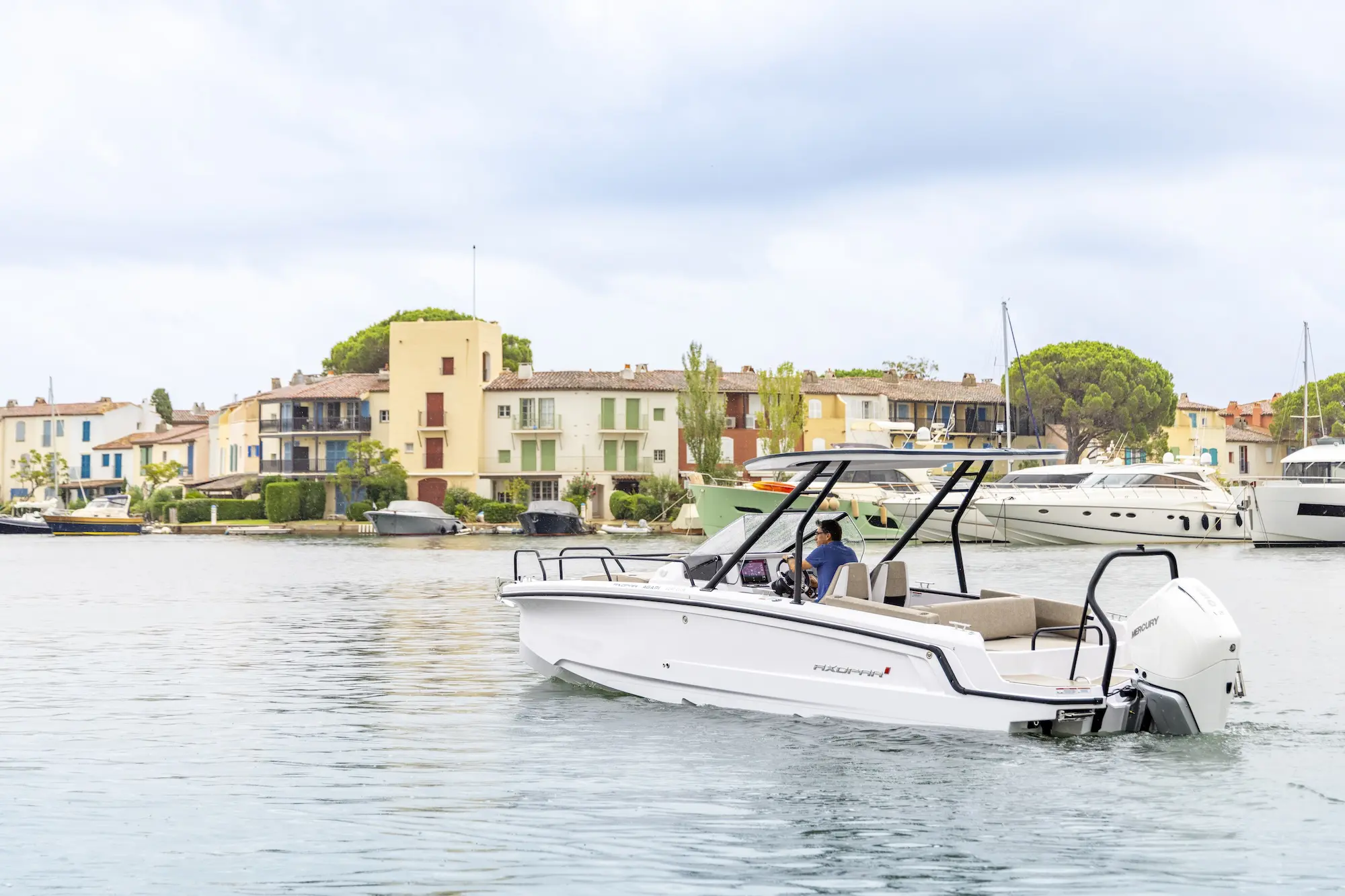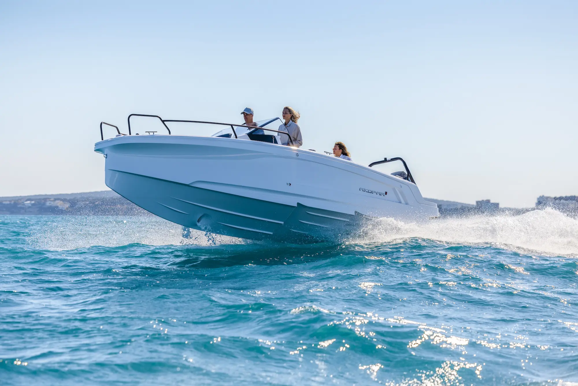 Beneath the waterline, the twin-stepped hull reduces drag and increases lift by channeling air under the boat, improving both efficiency and performance. The 25 Cross Bow planes at just 13 knots, cruises efficiently at 27 knots burning only 28L/h, and reaches speeds of up to 42 knots with a 250hp engine. With a 230L fuel capacity, this 25ft boat offers a cruising range of around 220 nautical miles, making it ideal for coastal runs, island-hopping, or chasing open-water adventures with confidence.