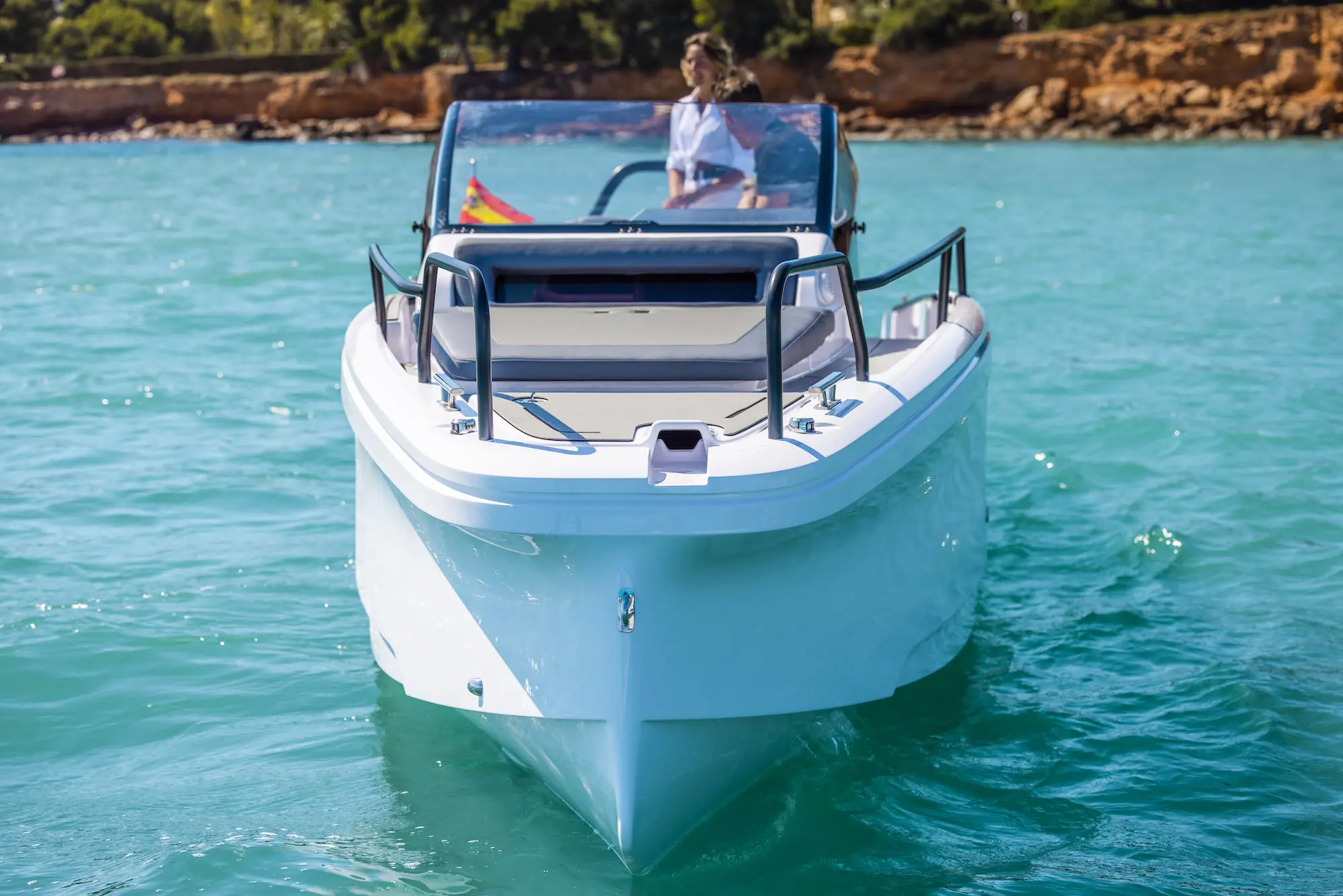 Its sharp-entry reverse bow is engineered to slice cleanly through waves, while wide spray-deflecting chines keep the deck dry and passengers comfortable. The centrally positioned helm and expansive windscreen enhance visibility and control, allowing for precise handling and minimal trim input even in changing sea conditions.