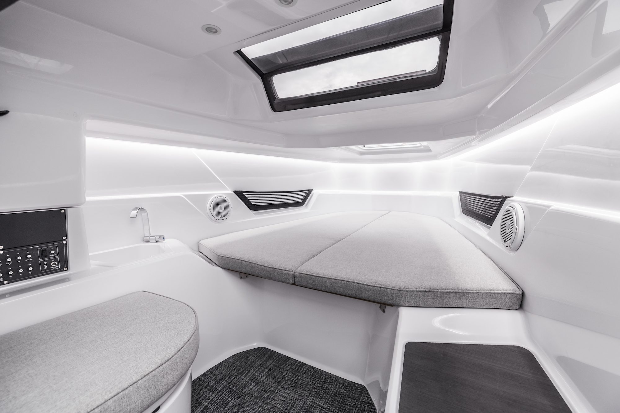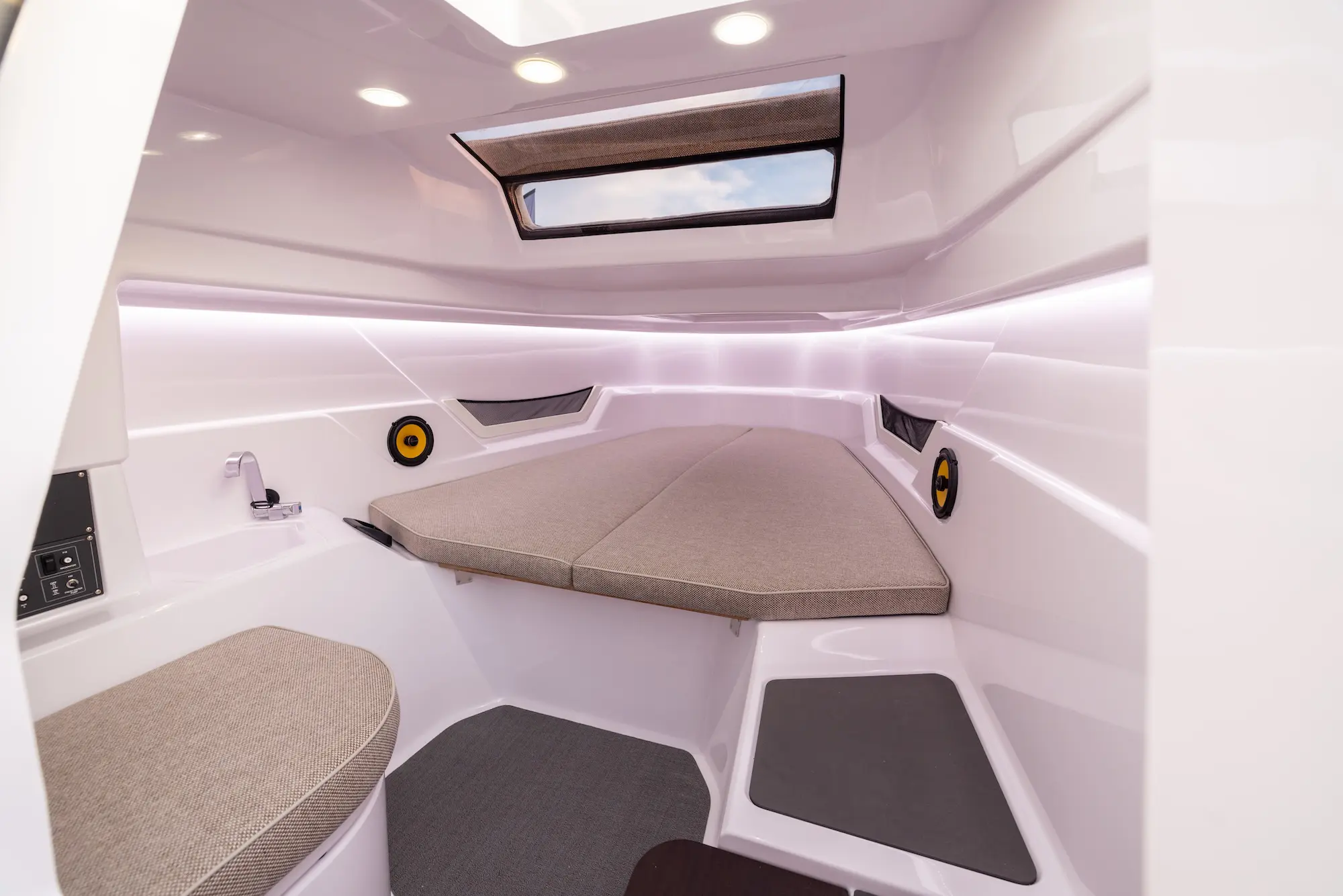 With multiple aft configurations available, including an open bench, multi-storage unit, or a U-sofa that converts to a sunbed, this trailer boat adapts to suit any outing. The full-beam sunbed above the cabin offers the perfect place to lounge, while the spacious, walkaround layout gives freedom to move with ease. For those seeking a capable, stylish and easily towable 25 foot boat, the Axopar 25 Cross Bow is the standout option in the class.
