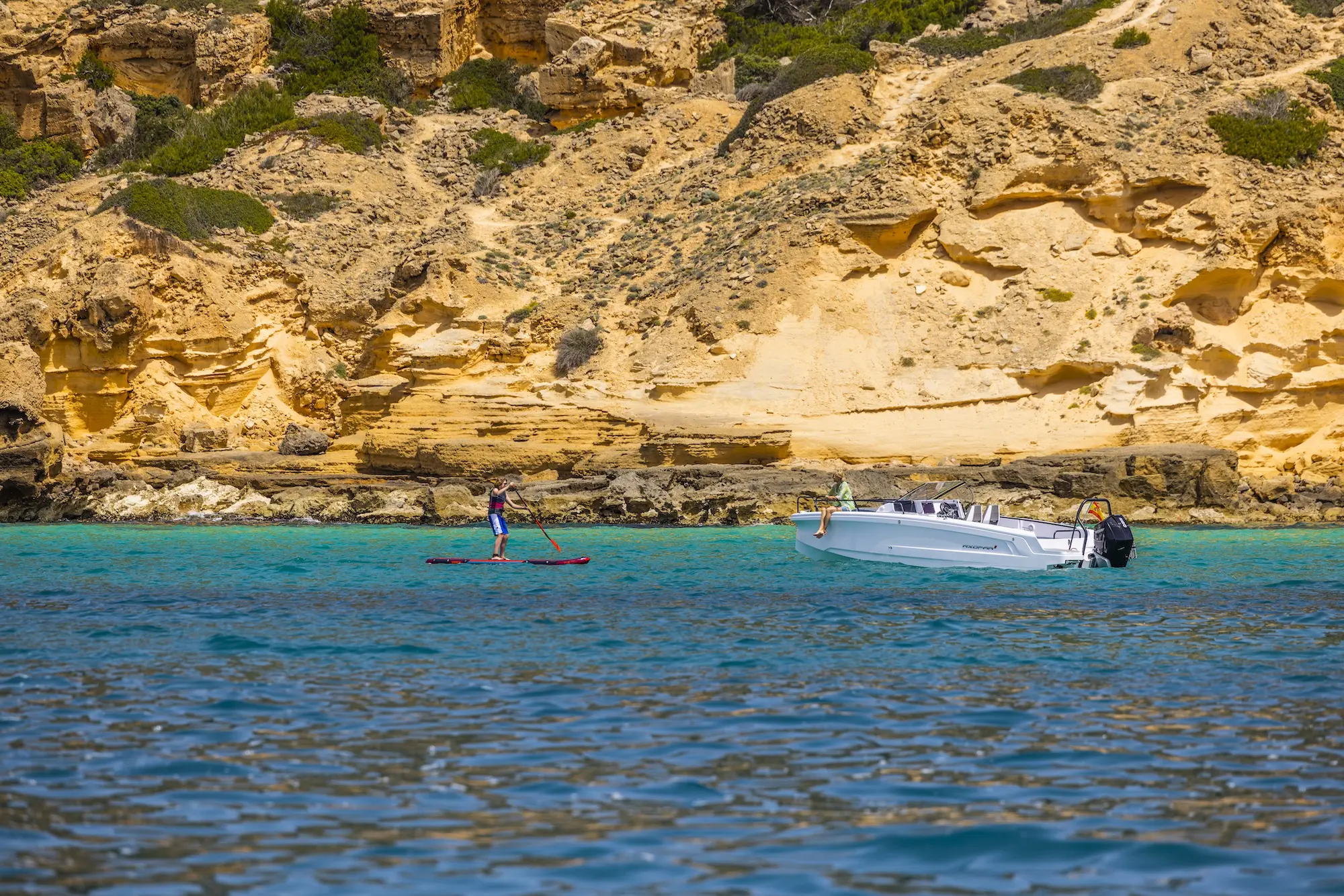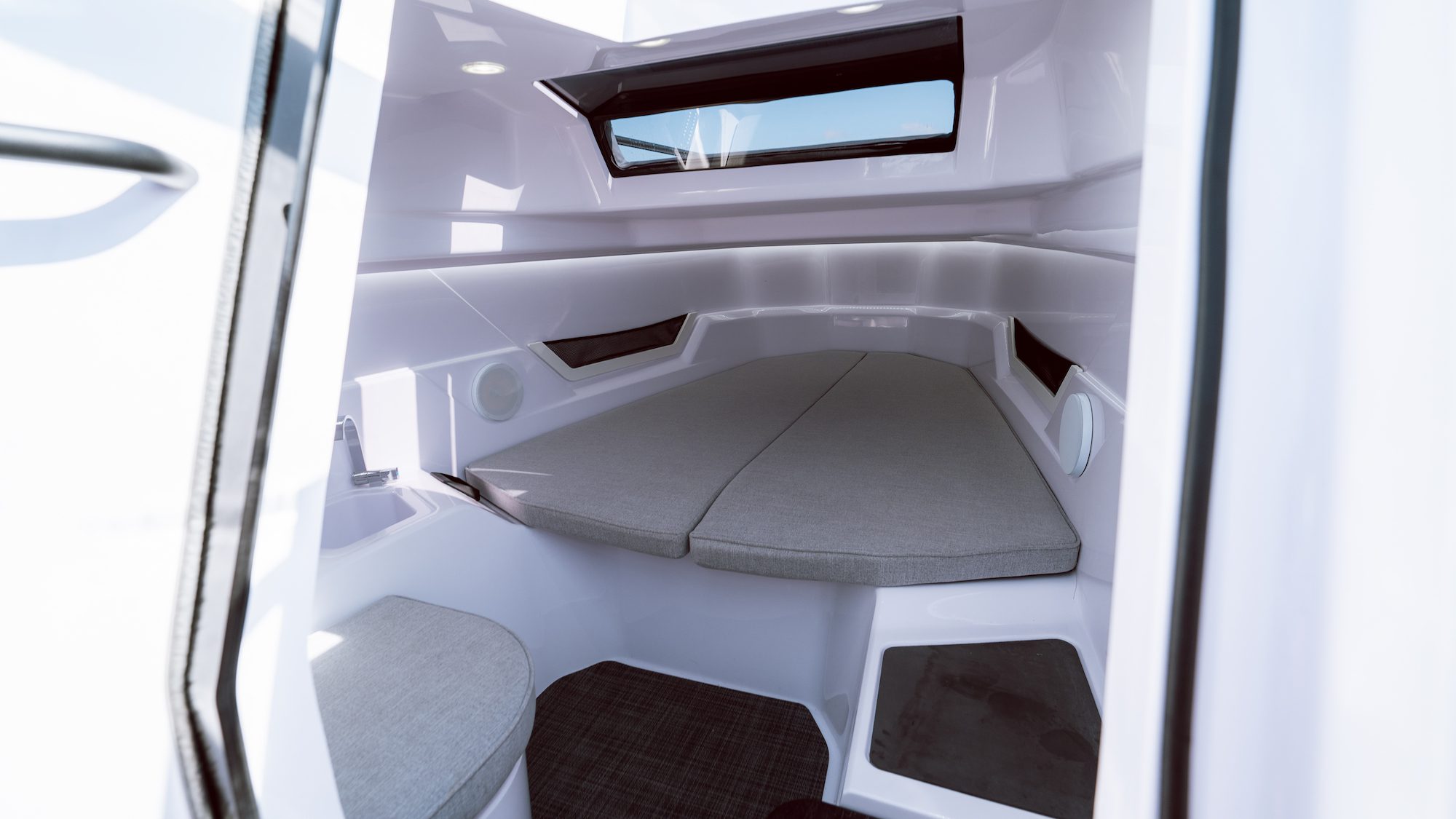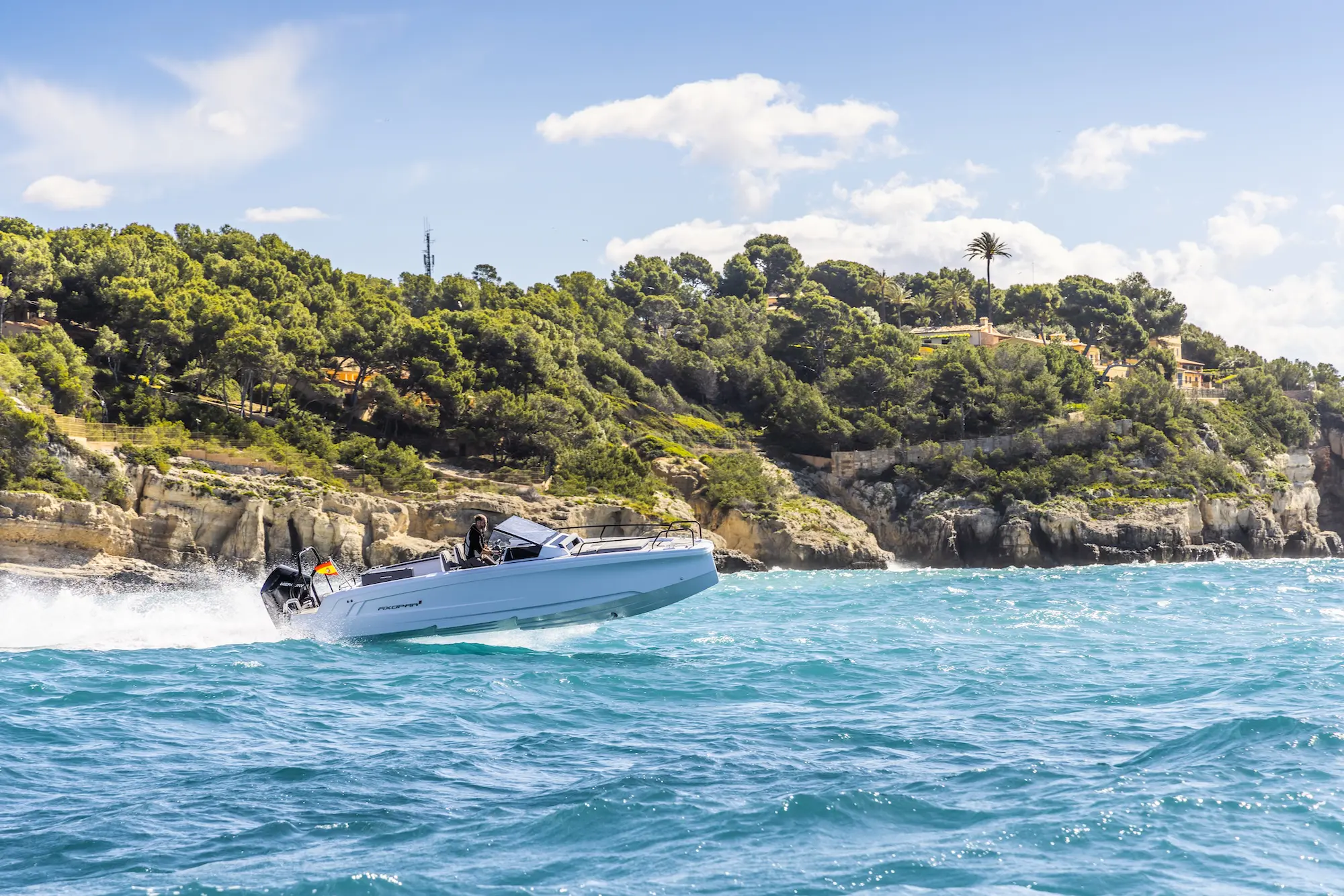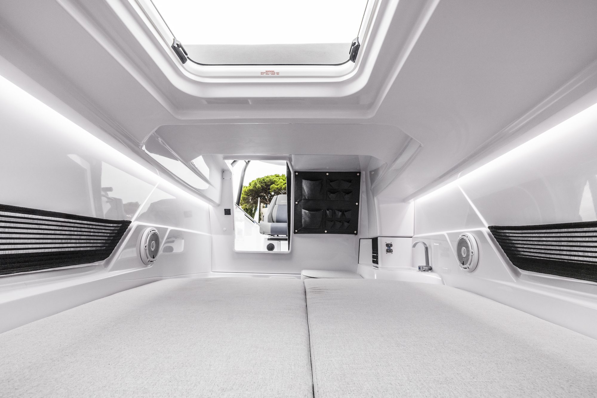 The Axopar 25 stays true to the brand’s DNA, sharp-entry bow, twin-stepped hull, and wide spray-deflecting chines, ensuring a smooth, dry ride even in choppy conditions. Its raised cuddy cabin provides sleeping space for two, a sink, and an optional toilet, making spontaneous overnight stays both comfortable and practical.