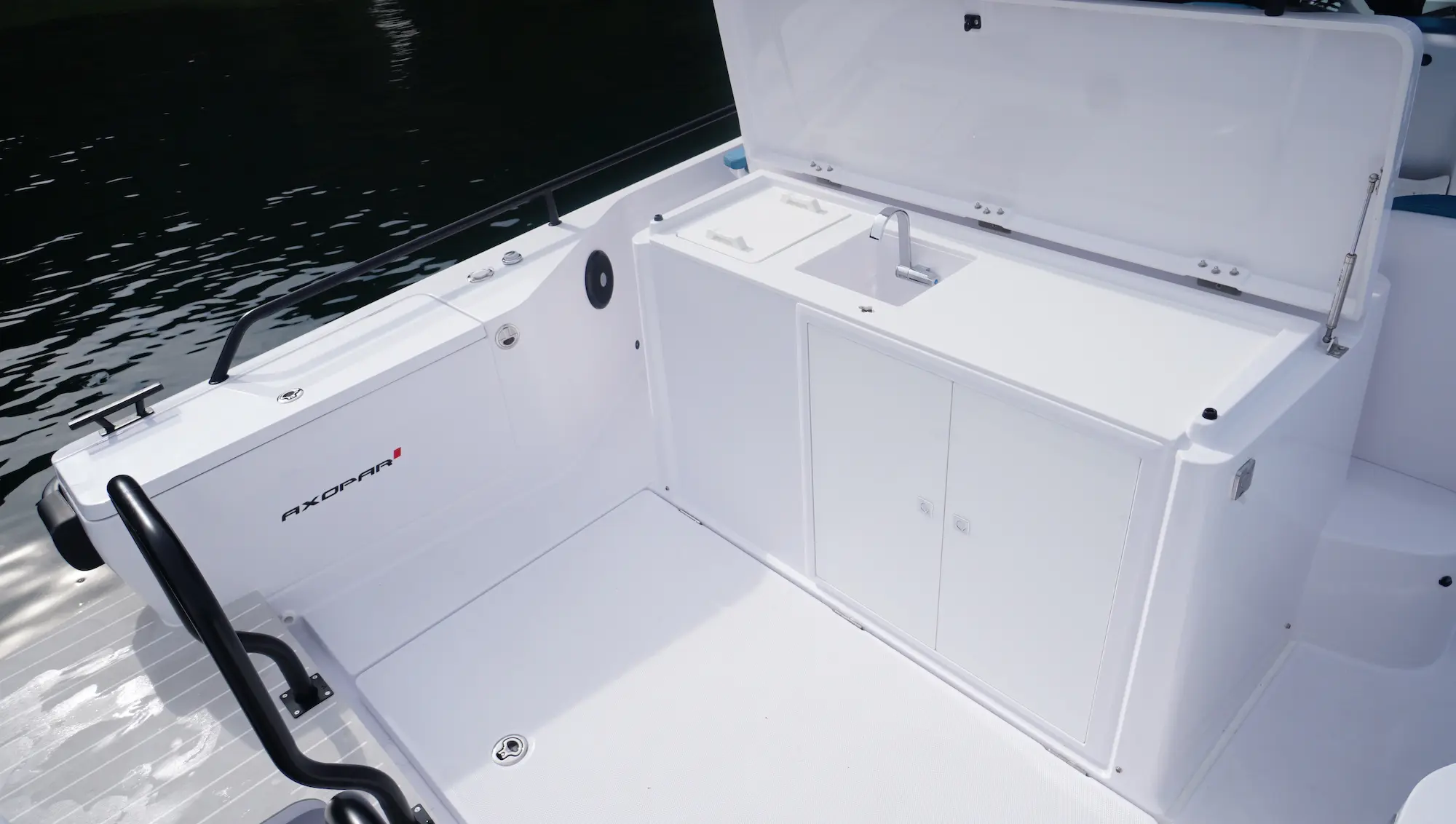 The helm can be turned into a perfect space for entertaining and alfresco dining with the optional table. This is just another way Axopar are making areas into multi-use areas.