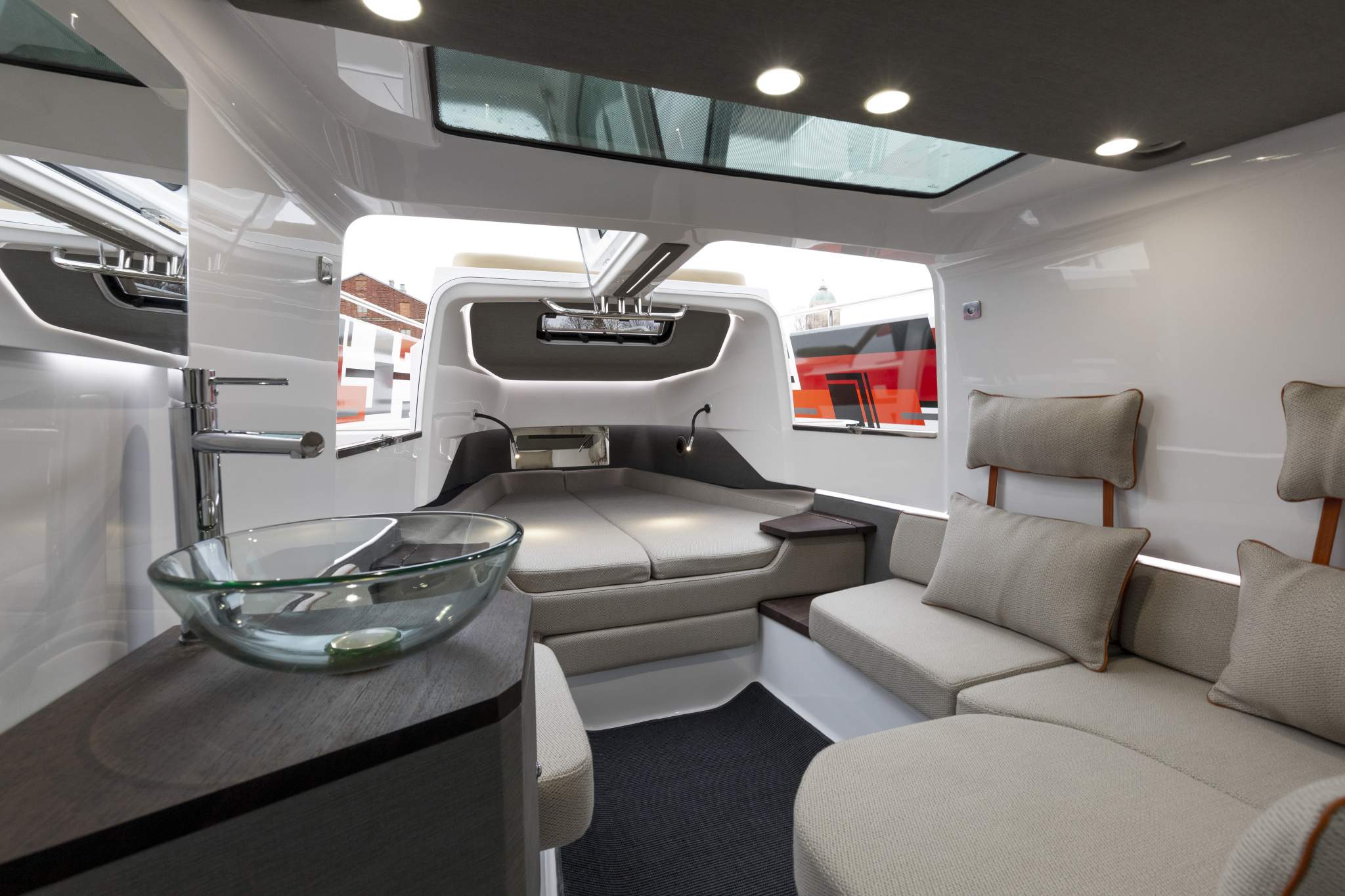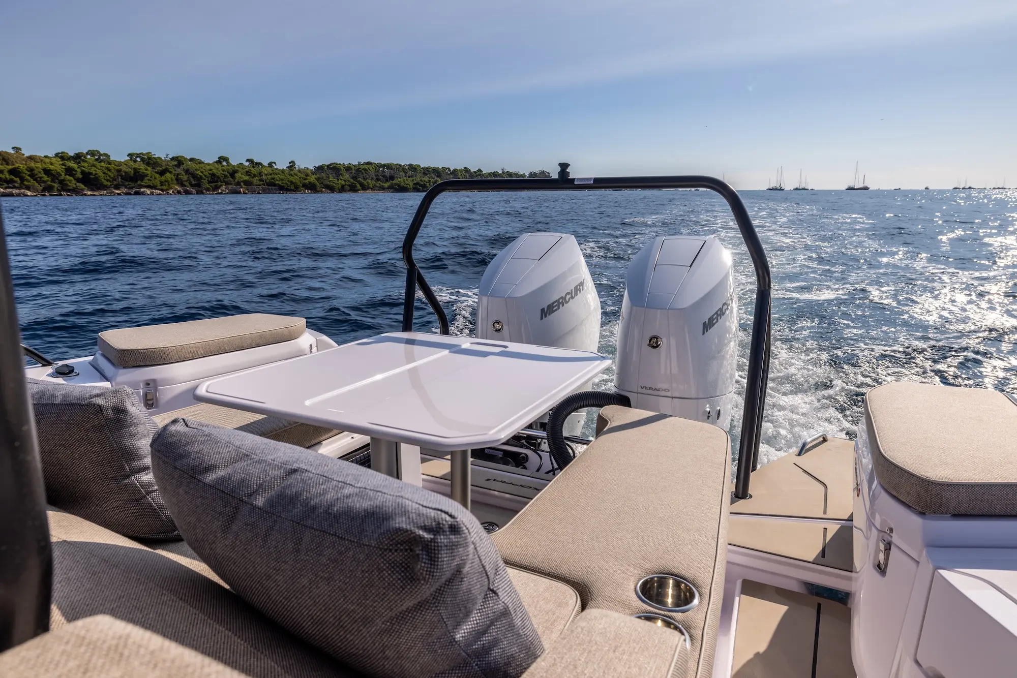 Onboard, seven fully adjustable sports seats surround a large table in the cockpit, ideal for entertaining, sunbathing, or switching into adventure mode. The spacious bow can be configured for lounging or social seating, while the forward cabin includes a built-in toilet, sink, and optional overnight upgrades.