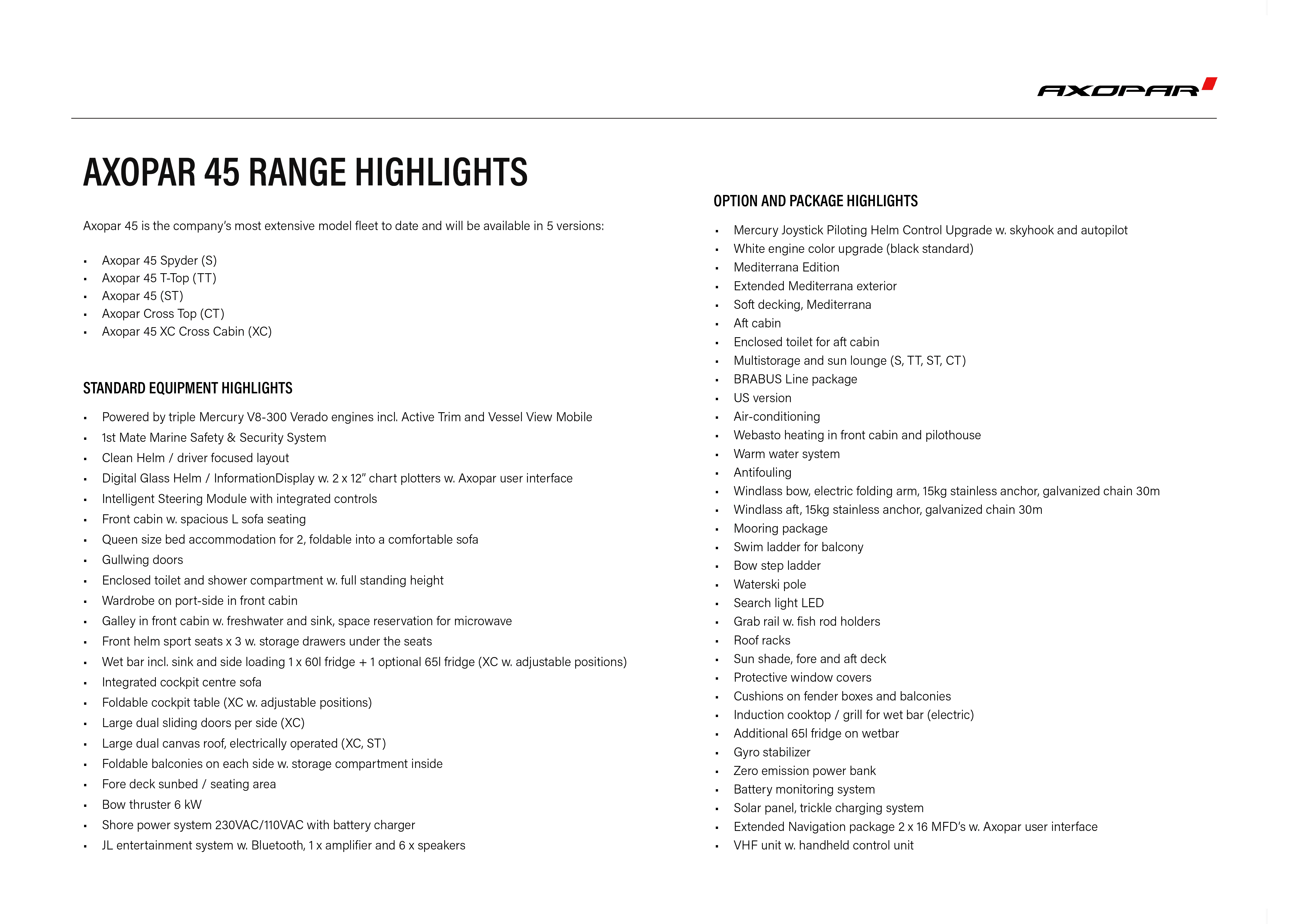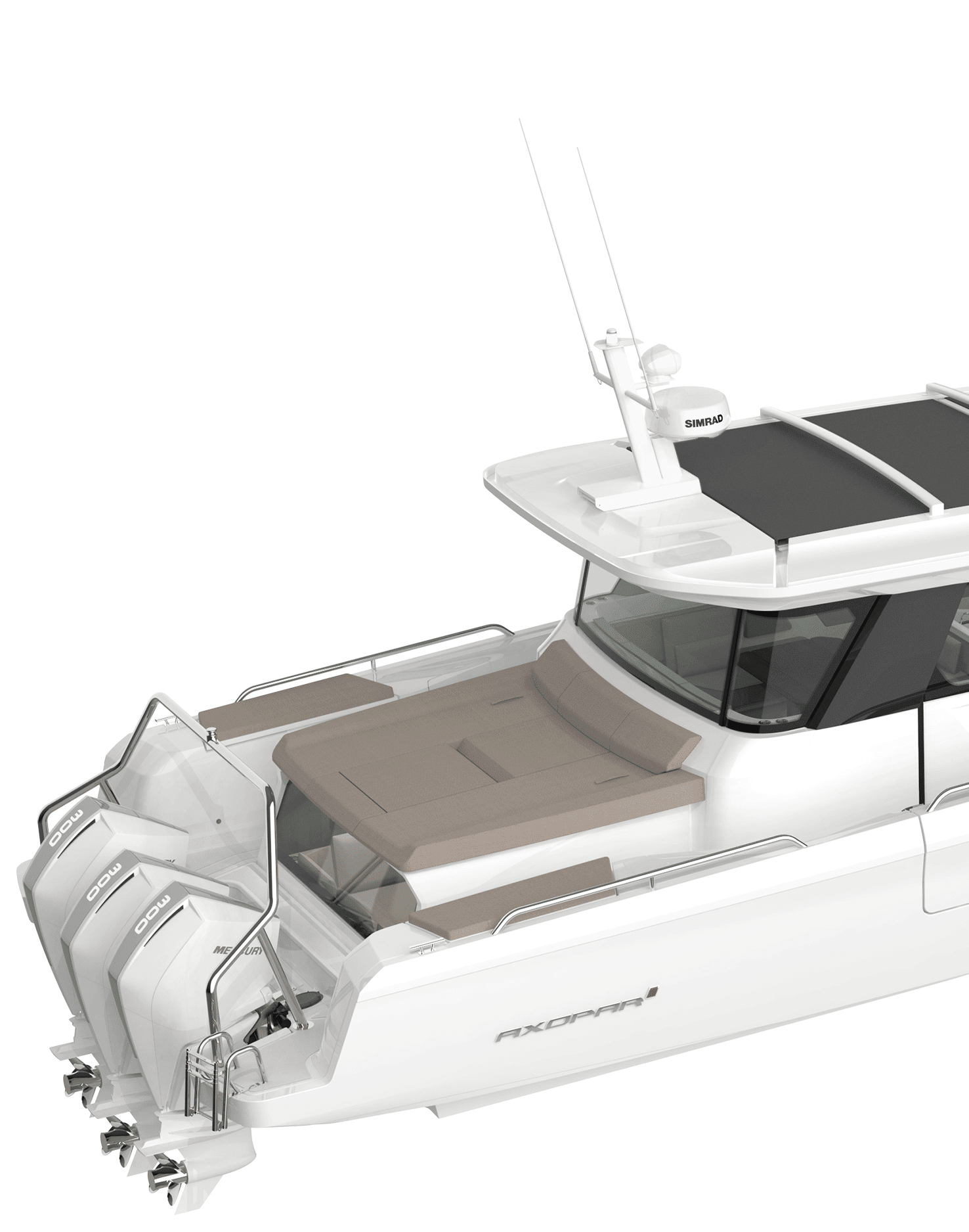 The Axopar 45 is available in three models: the open-air Axopar 45 Sun Top (ST), the crossover Axopar 45 Cross Top (CT) and the fully enclosed Axopar 45 Cross Cabin (XC). Each version offers a spacious walkaround layout, exceptional offshore cruising capability, and the option to tailor your setup with features like an aft cabin, wet bar, BRABUS Line styling, and more.