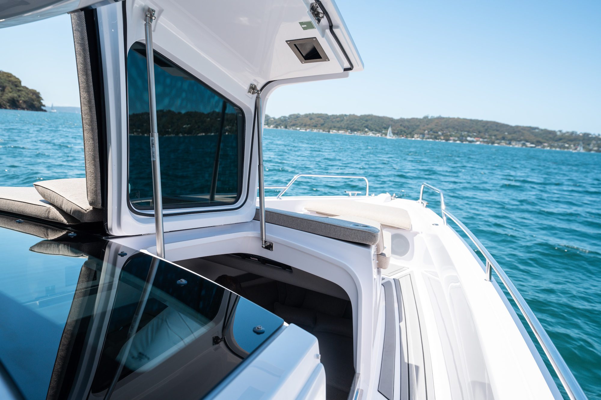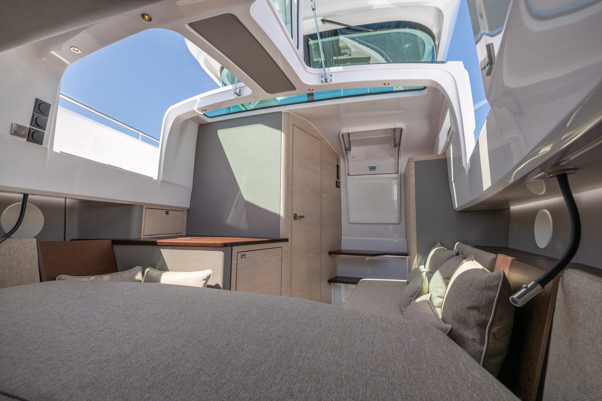 Powered by triple Mercury V8 300hp or 350hp Verado engines, the Axopar 45 XC delivers class-leading fuel efficiency with cruising speeds around 32 knots and top speeds around 50 knots. The walkaround pilothouse features two wide multiway sliding side doors and dual electric sunroofs, providing seamless transitions from enclosed comfort to open-air exhilaration.