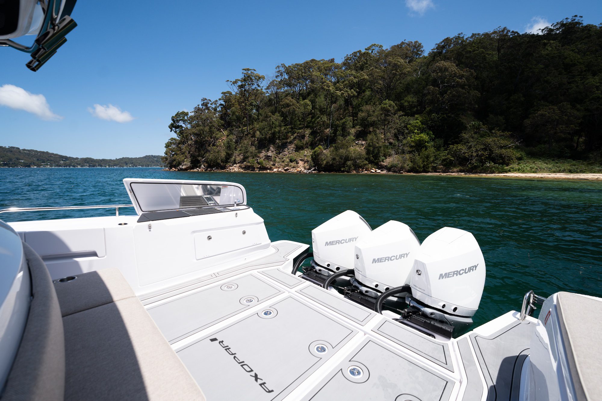 The sharp entry, long waterline, and twin-step configuration work together to reduce drag and improve lift, keeping the ride dry and composed even at higher speeds. The hull is finely tuned for use with triple Mercury 300hp or 350hp Verado engines, allowing this 45 foot boat to reach speeds of up to 50 knots while cruising efficiently between 22 and 35 knots.