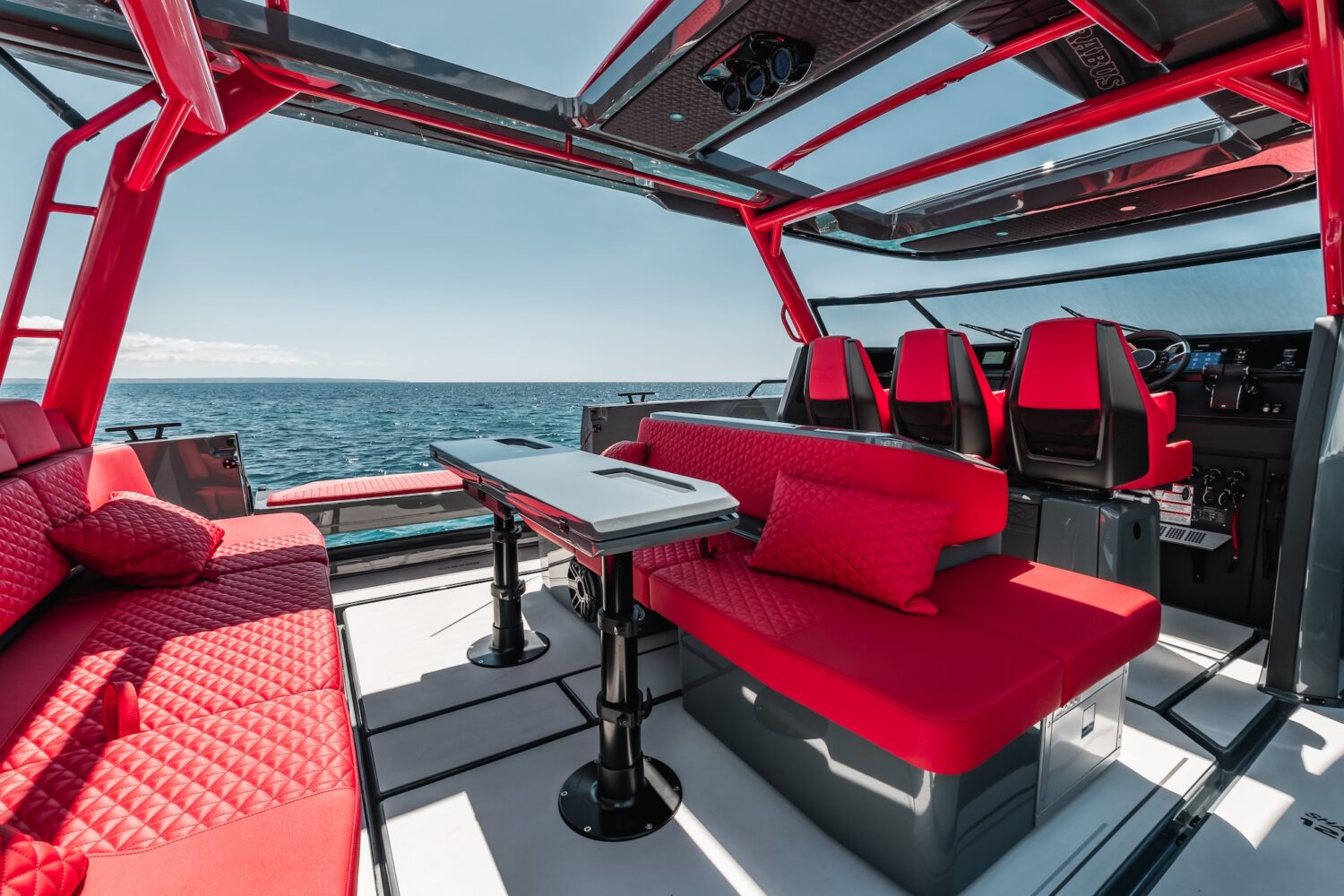 Powered by triple 400 HP Mercury Racing engines, this vessel offers unmatched speed and maneuverability, reaching top speeds of 55 knots. The cockpit is equipped with state-of-the-art technology, including Simrad navigational touchscreen displays and Mercury’s JPO joystick steering.