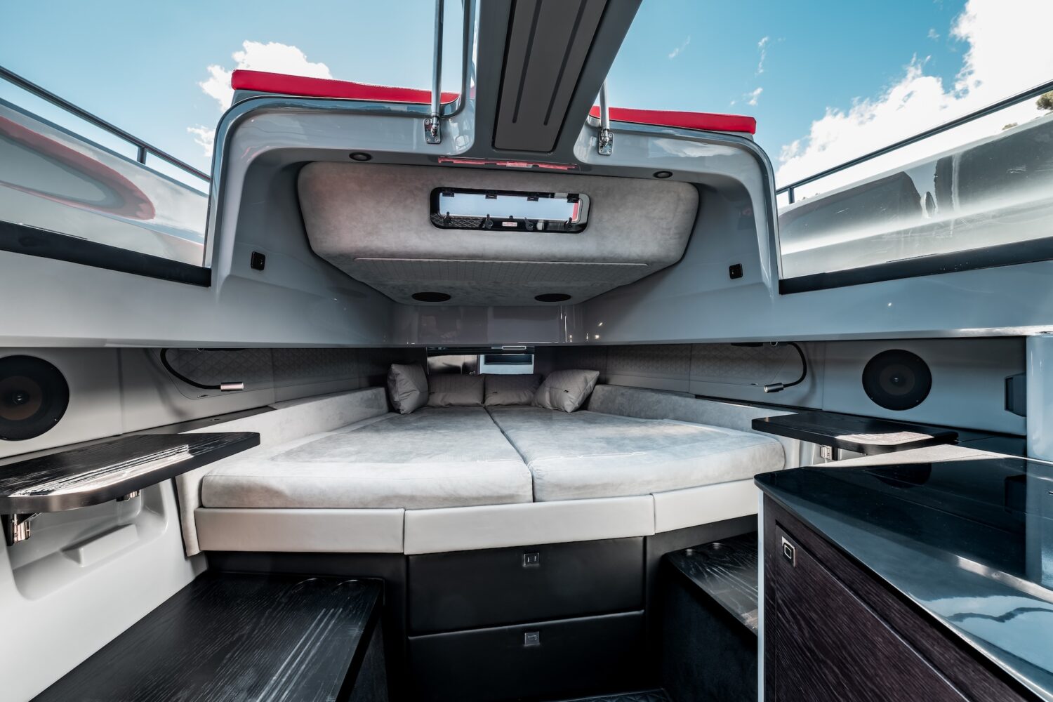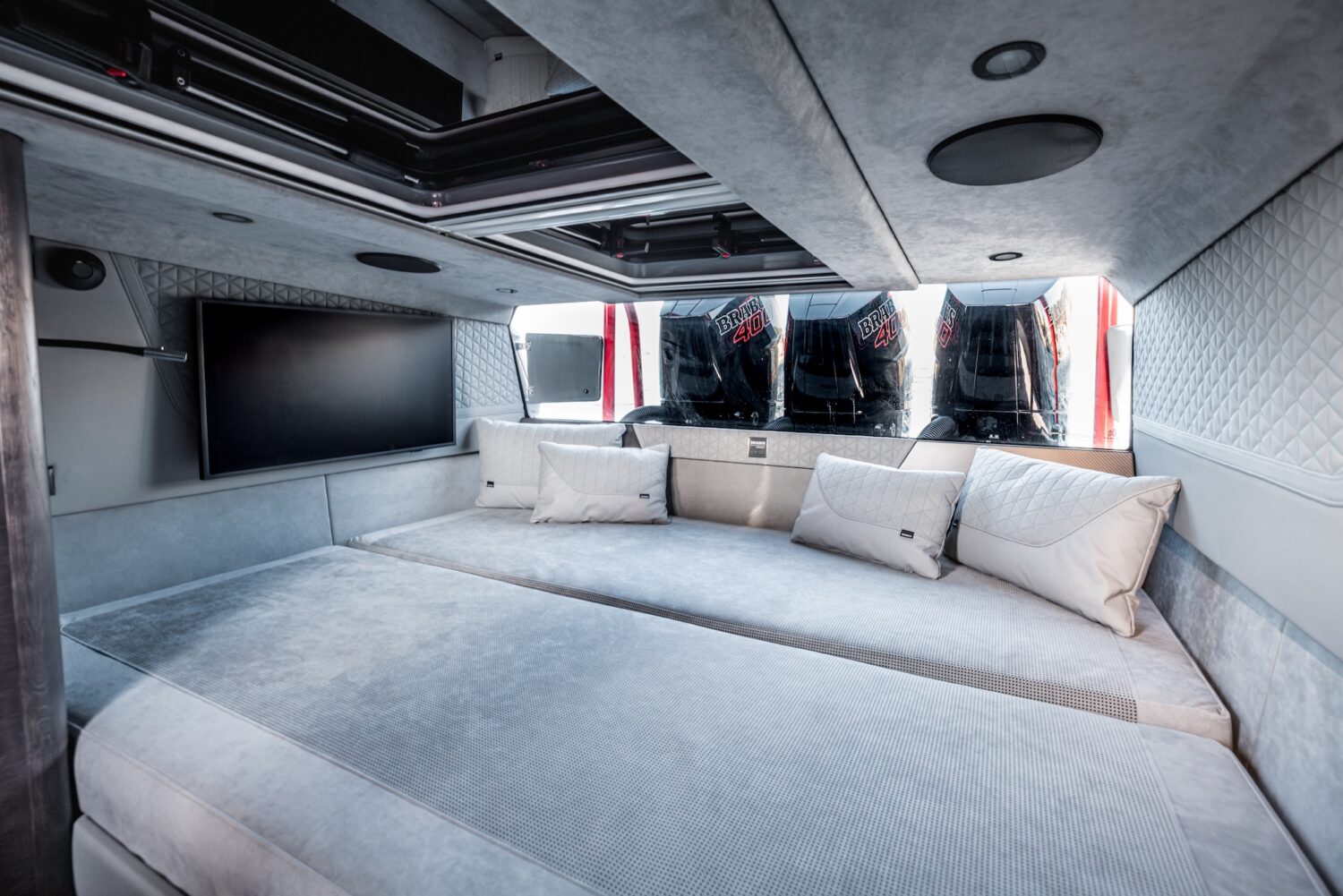 Inside, the BRABUS Shadow 1200 offers luxurious accommodations with ample space for socializing and relaxation. Whether cruising during the day or staying overnight, you’ll enjoy premium features such as JL audio systems and LED illuminated balcony doors.