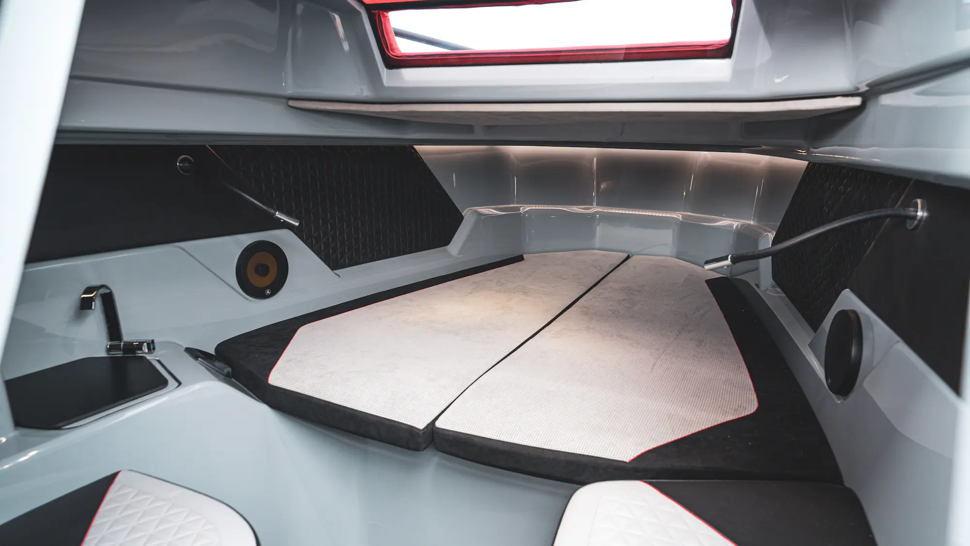 The aft is where the action begins, with the spacious multi-storage compartment for water sports gear, a swim ladder, as well as a water ski pole. The BRABUS Shadow 300 Edition One’s commodious fore cabin comprises a double bed, toilet, and freshwater system. Optional fridge and sink units can be integrated under the boat’s front seats. At the bow, an extra comfortable sunbed offers a perfect space to socialise with friends or relax in the sun.