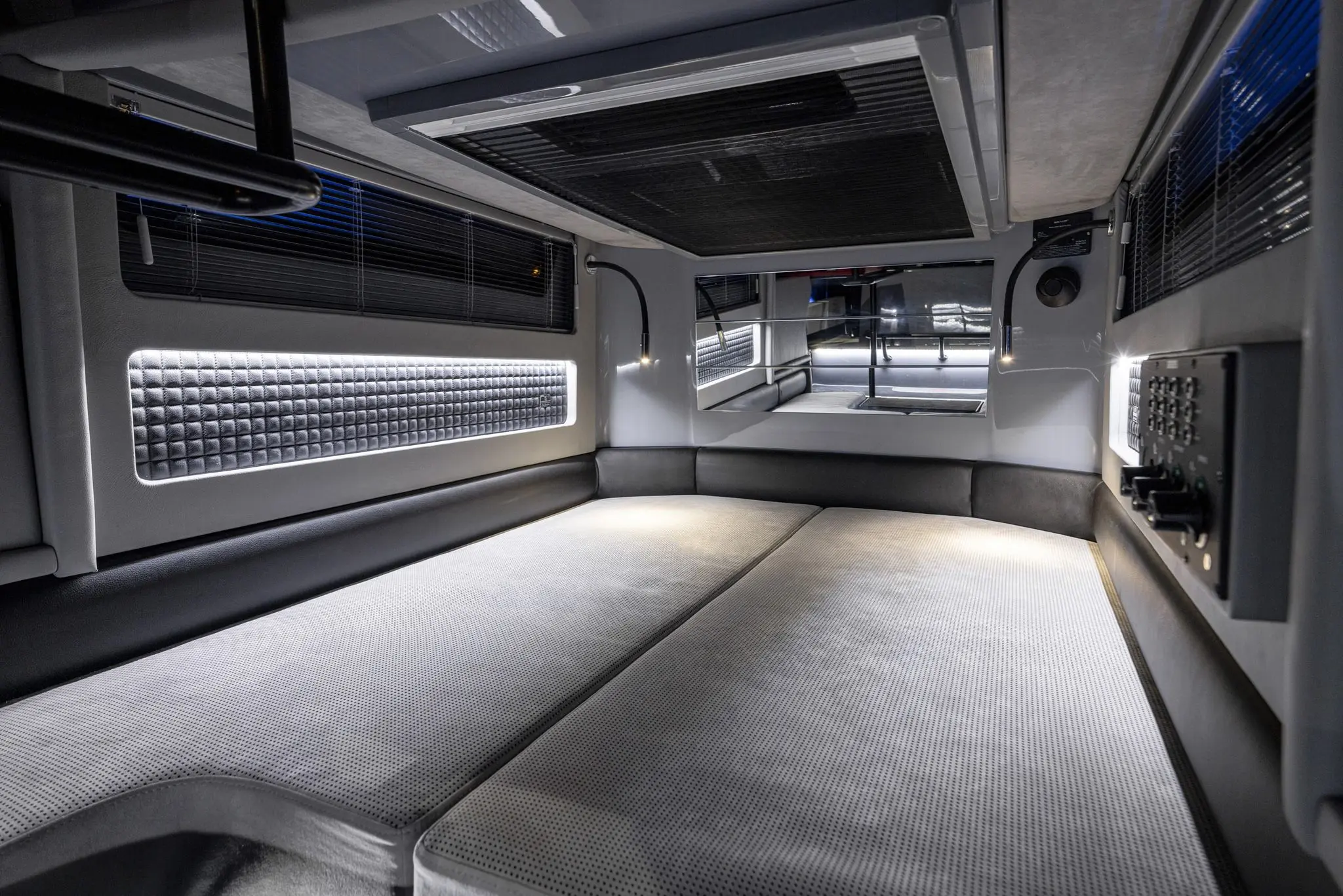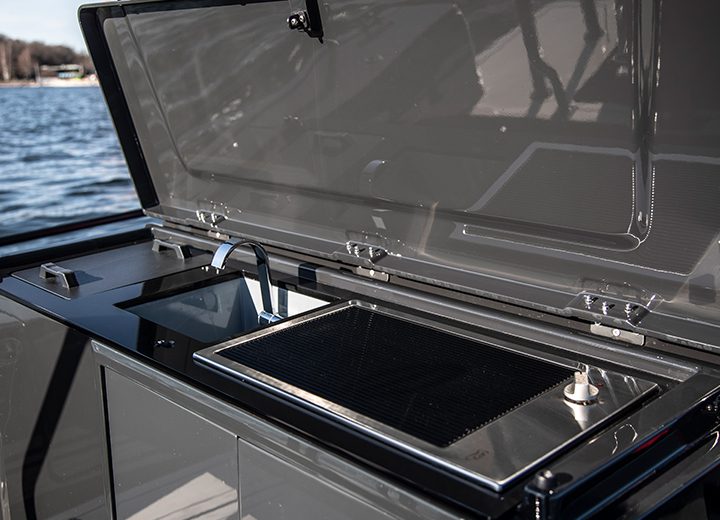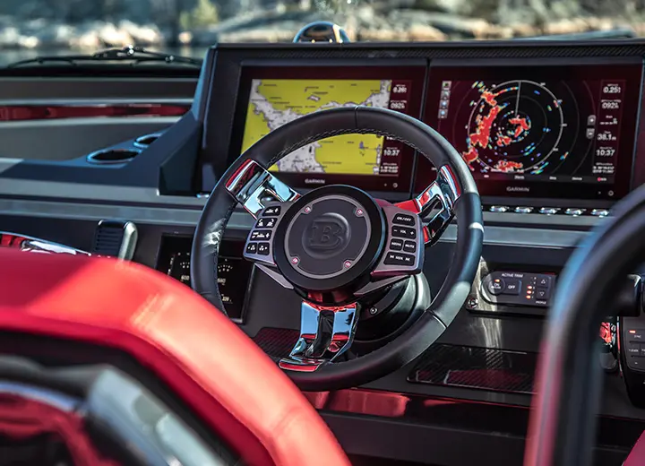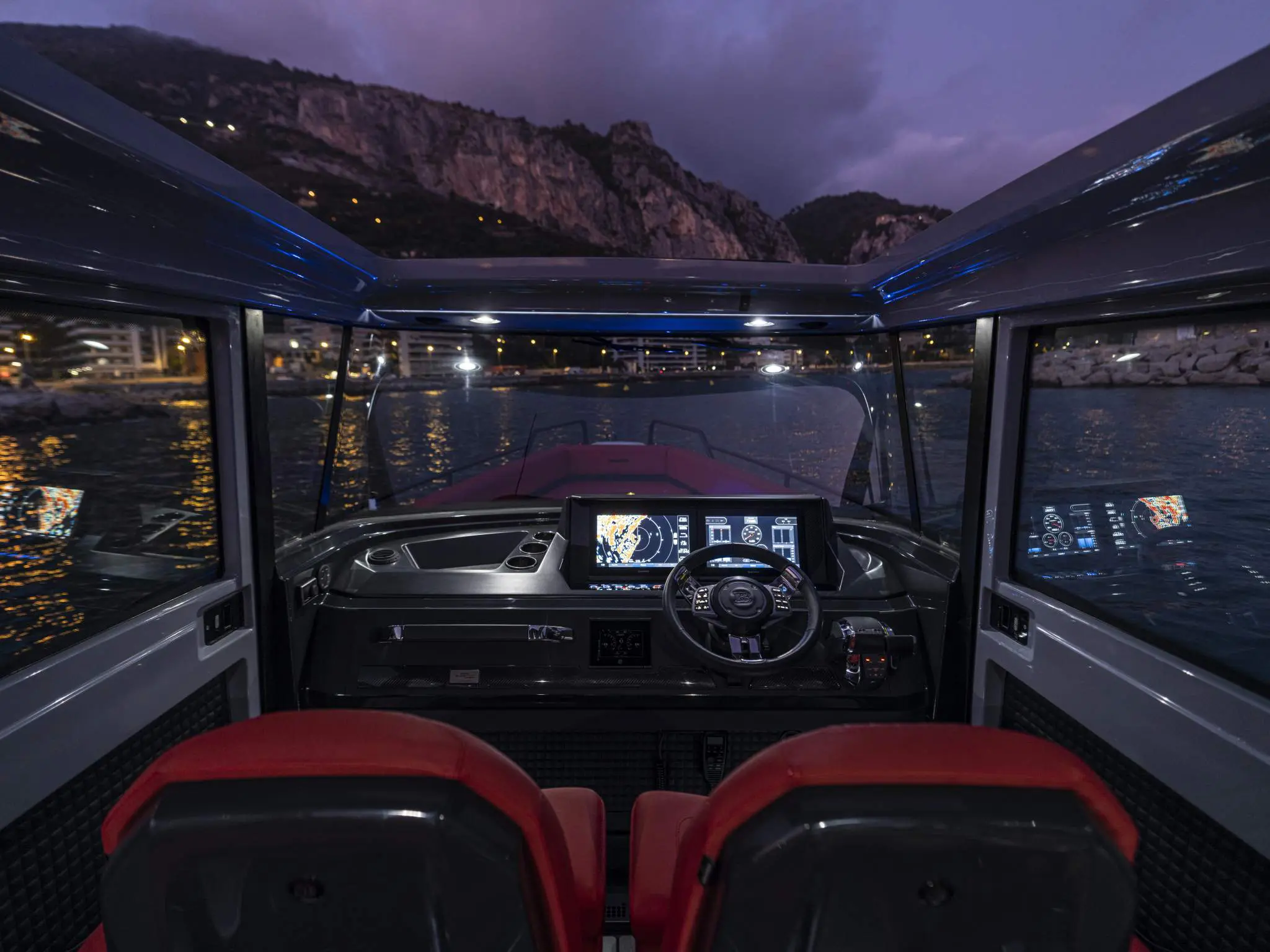 The space inside the cabin is extremely inviting, comfortable and very civilised. Enjoy being cossetted in the lap of luxury; sitting in sumptuous seats, surrounded by BRABUS Fine Leather® upholstery and interior detailing that lifts this boat from being merely very good, to well above the norm. An electrical roof system will transform this elegant private space, that’s capable of keeping the harshest weather at bay, into an airy luxury lounge that’s open to the kiss of the summer sun.