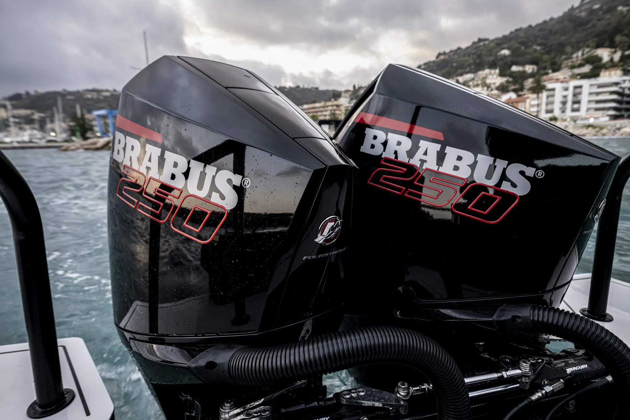 It is a stylish, superior boat, available in a choice of three, contemporary gelcoat colours and two different seat fabric colours, including Platinum Grey, White Grey and Glacier Blue, and two-seat fabric/sun pad cushion colours to choose from including BRABUS Red and BRABUS Cappuccino.