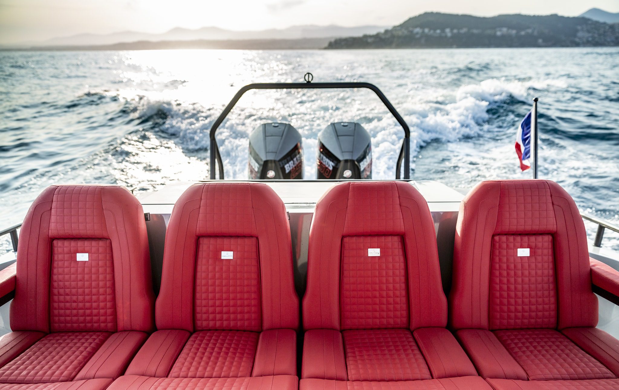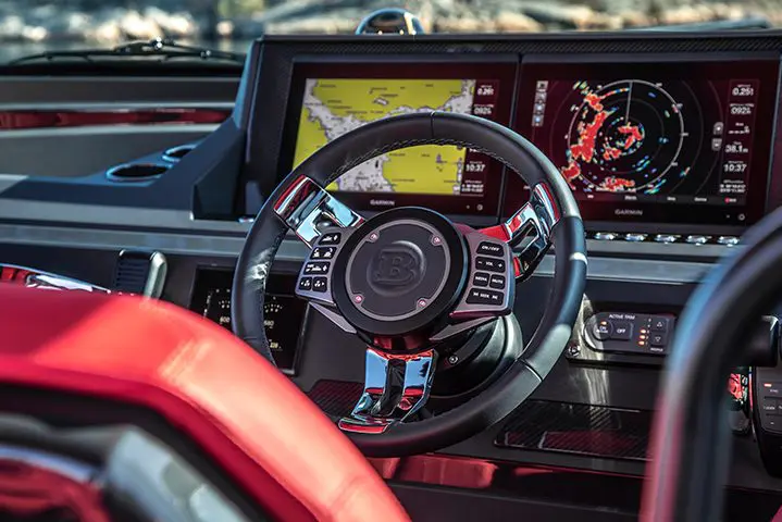It is a stylish, superior boat, available in a choice of three, contemporary gelcoat colours and two different seat fabric colours, including Platinum Grey, White Grey and Glacier Blue, and two-seat fabric / sun pad cushion colours to choose from including BRABUS Red and BRABUS Cappuccino.