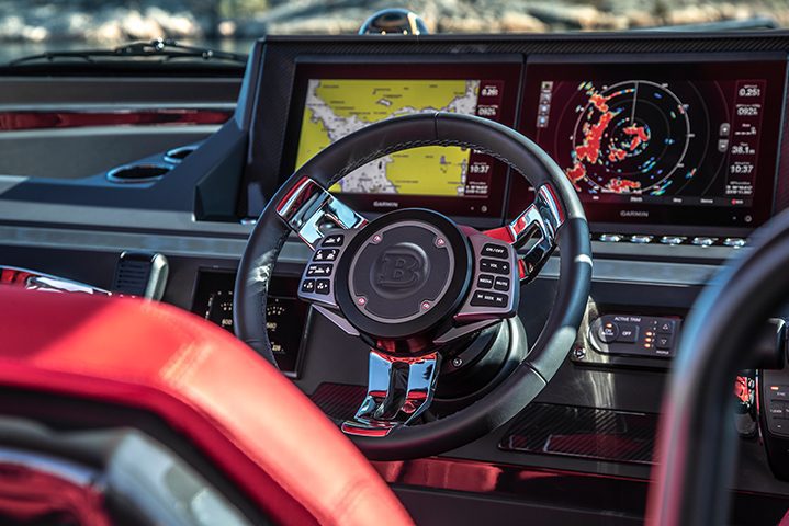 Built with Mercury Marine’s latest XS-Pro V8 FourStroke engines, it offers blindingly quick acceleration with a ‘kick in the back’ feeling, vice-like grip & handling, even from 40 knots fully loaded and with eight people on board. The BRABUS Shadow 500 design is underpinned by the successful Axopar 28 hull, with further optimised hydrodynamics and carbon-fibre reinforcing for even better overall performance and handling.