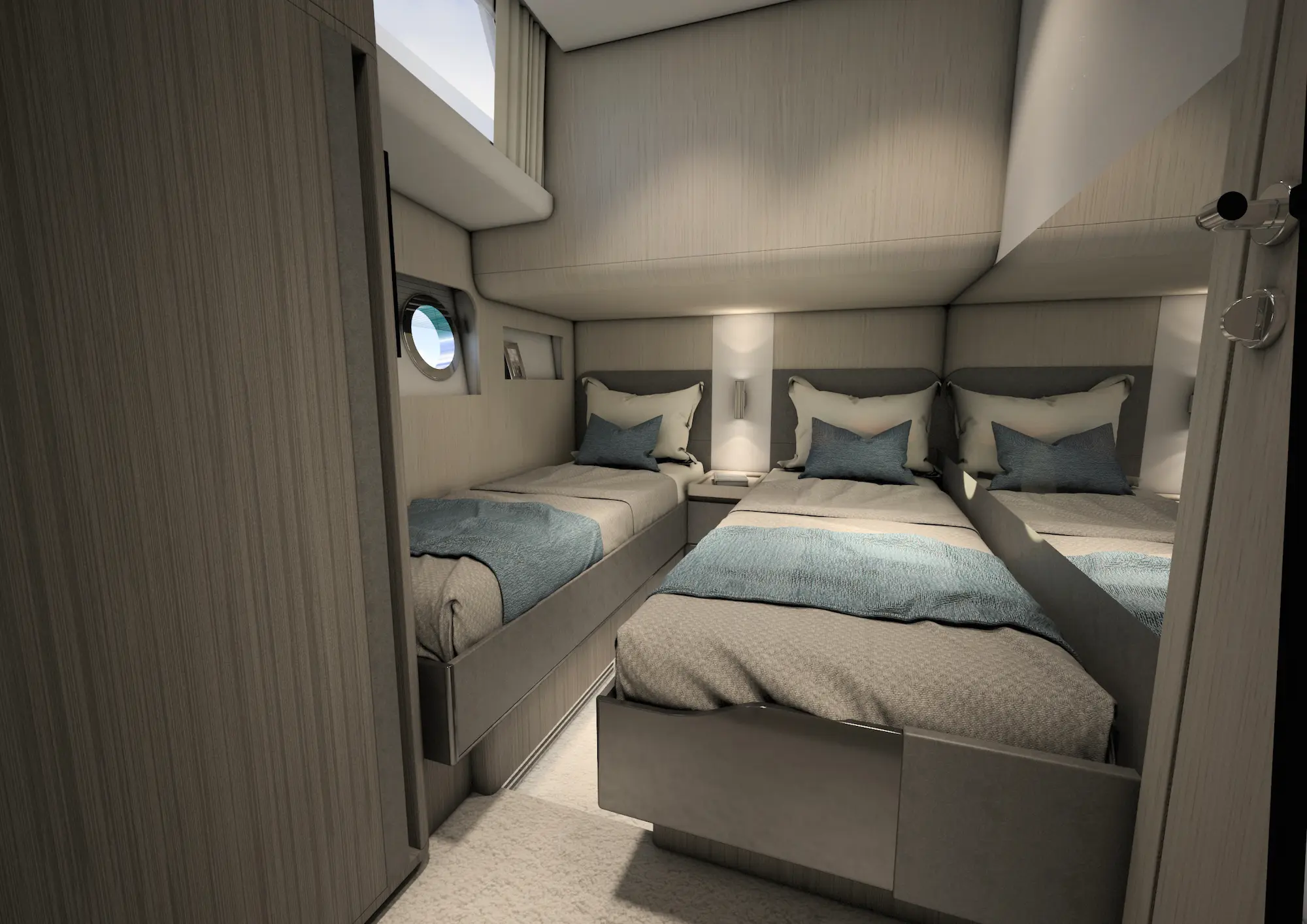 Externally, both models boast luxury and functionality, featuring spacious lounges, a cockpit lounge with panoramic water views, and a flexible layout for relaxation. The bow lounge provides an unmatched 360-degree sea view, while the integrated stern bench enhances comfort on the bathing platform.