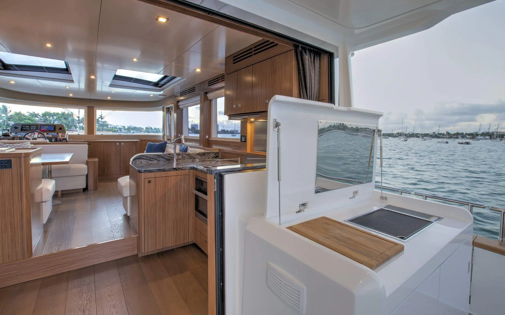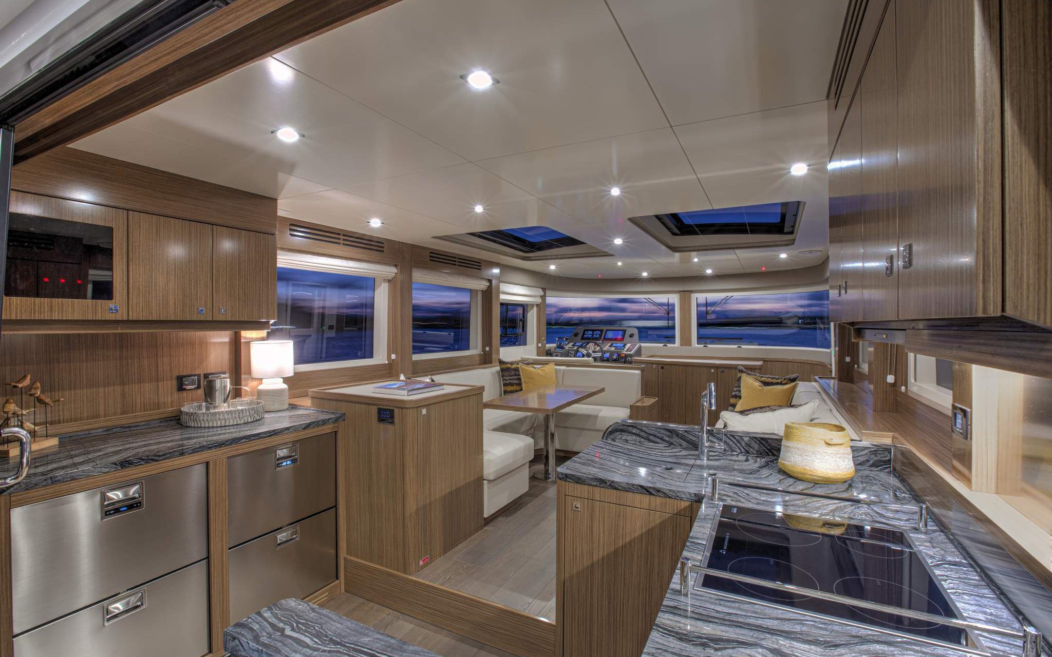 With the huge lateral windows running full length without interruption, with another on the cabin-top, natural light permeates the interiors bringing out the best of the contrasting colours of the oak and wengé.
