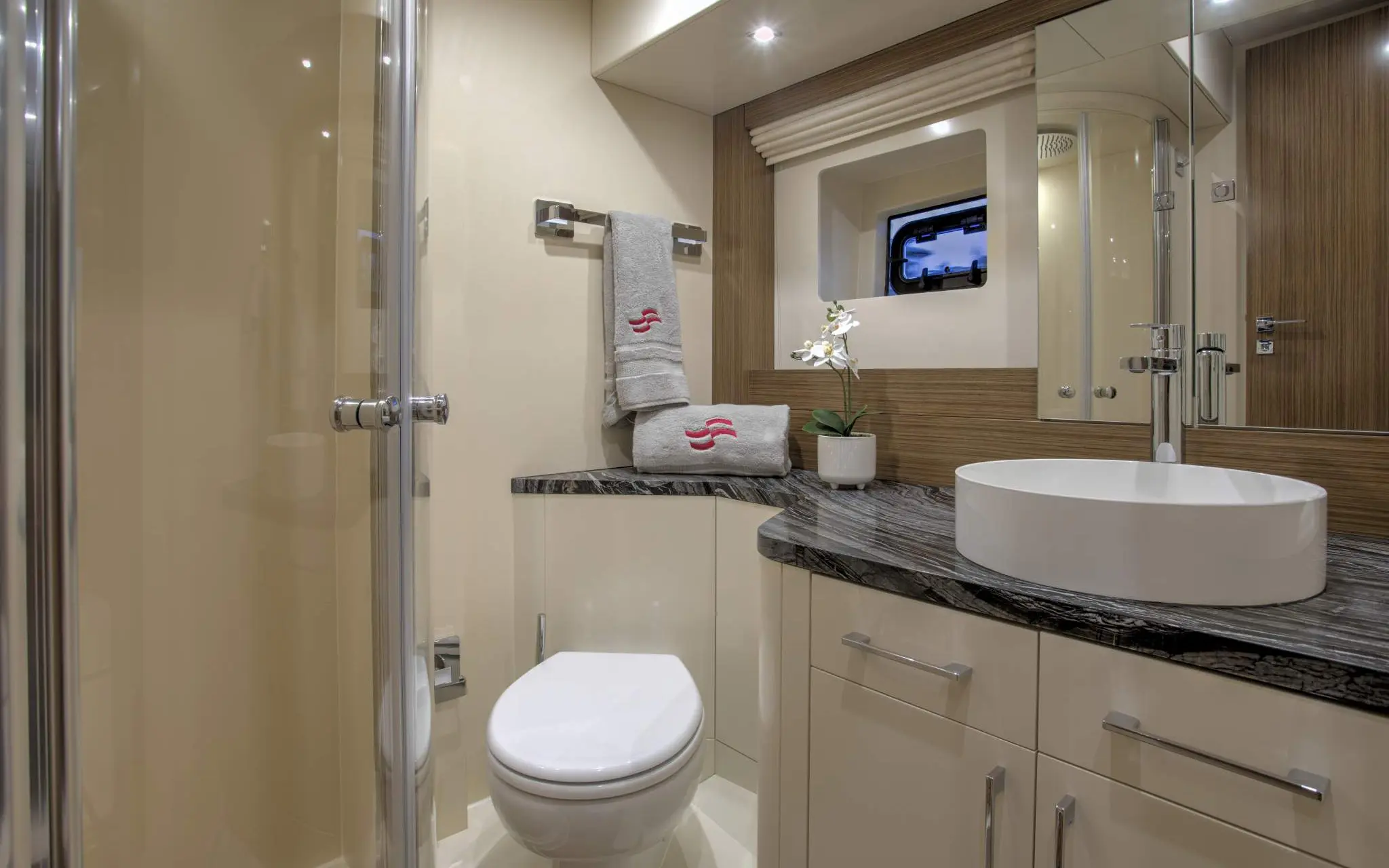 However, advanced engineering doesn’t compromise the sleek look and sculptured lines which convey high quality and refined style. The interior has three lower deck layouts, all which offer significant space and function. The forward master cabin optional layout offers direct access to the large foredeck – a design solution usually found only on much larger yachts.