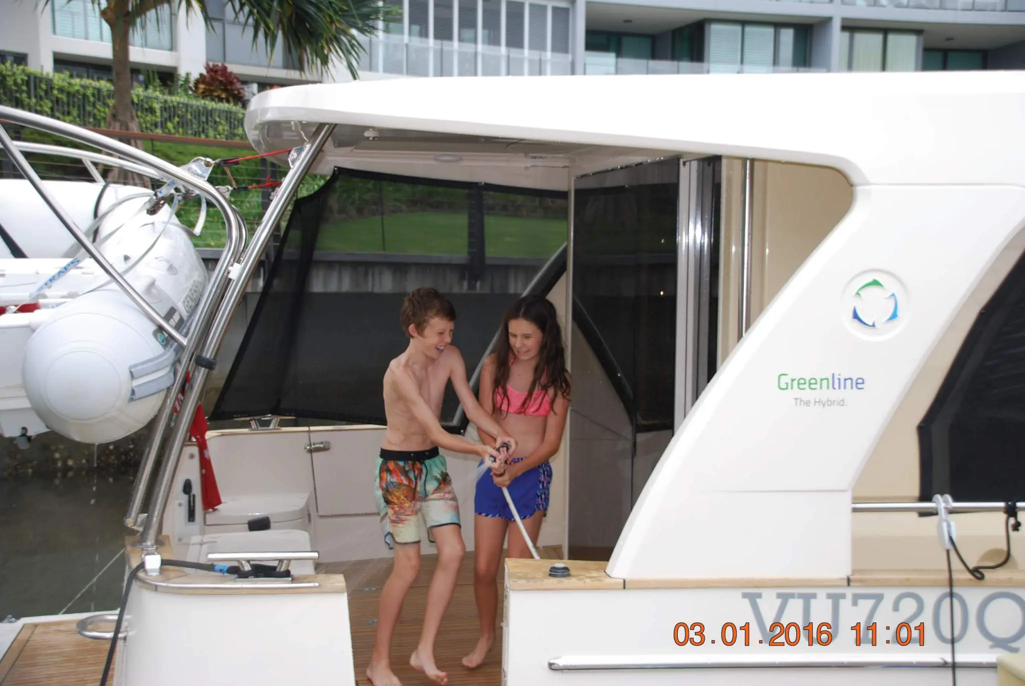 While the Greenline 33 left a lasting impression, it was the promise of a new 40 ft, twin-engine model perfectly suited for extended cruising that captured their hearts. “We liked the layout with a full-size fridge, pop up TV and plenty of space internally due to the generous beam. The master cabin layout also suited us particularly the way the queen bed could be spit to allow additional floor space during the day.” Luxuries like air conditioning, a pop-up TV, and the convenient Davit System for their dinghy enhance their onboard experience and also helped seal the deal.