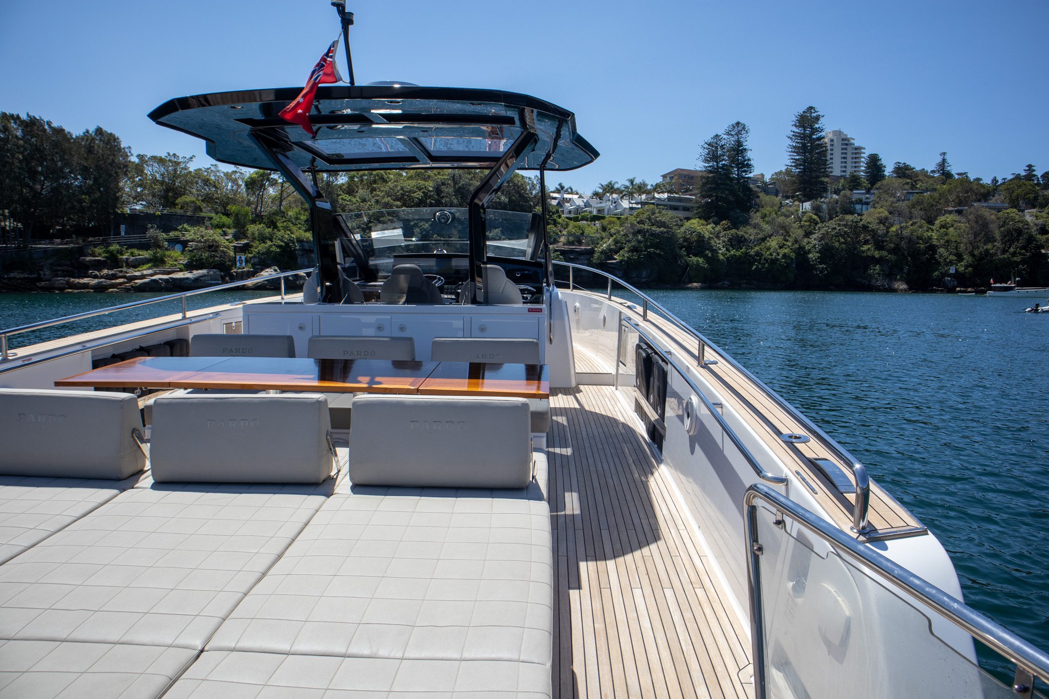- Generous Deck Space: The Pardo 43 offers a generous deck space with ample seating, a sunbathing area, and a dining area, providing plenty of room for up to 12 guests to relax, socialise, and take in the panoramic views of Sydney Harbour. Its spacious and well-designed exterior makes it perfect for entertaining, or enjoying al fresco dining. Plus the aft hydraulic swim platform makes taking a dip effortless.