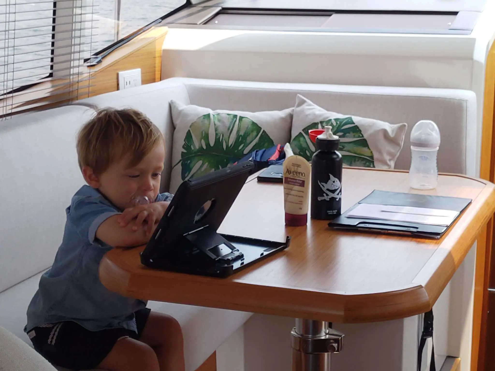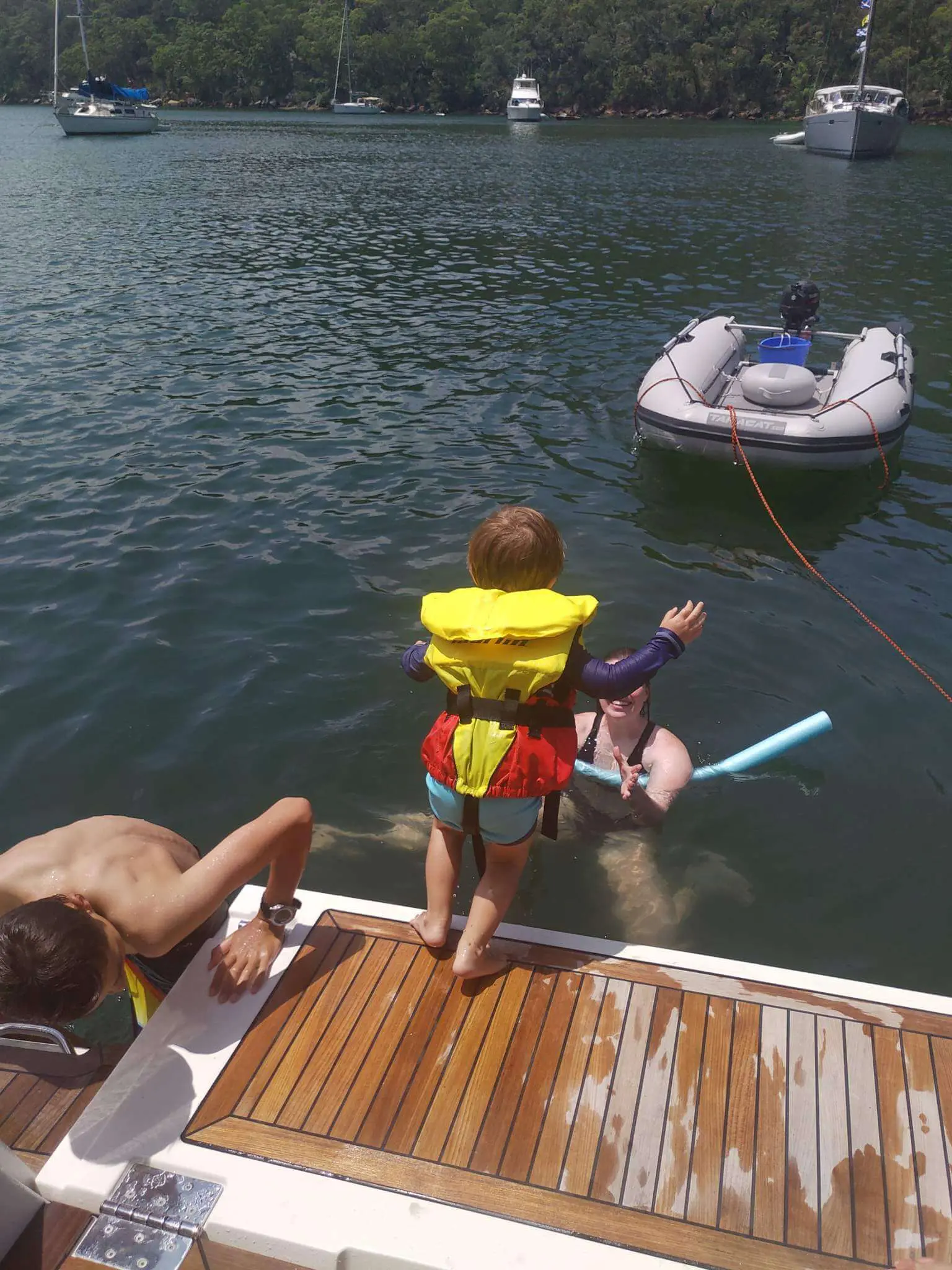 After overnighting in Yeomans Bay one of our sons (Christopher)  and his family (Kim, Logan and Hugo) met us in their RIB and spent a lovely day aboard. Plenty of space and easy access to the water with the lowering transom.