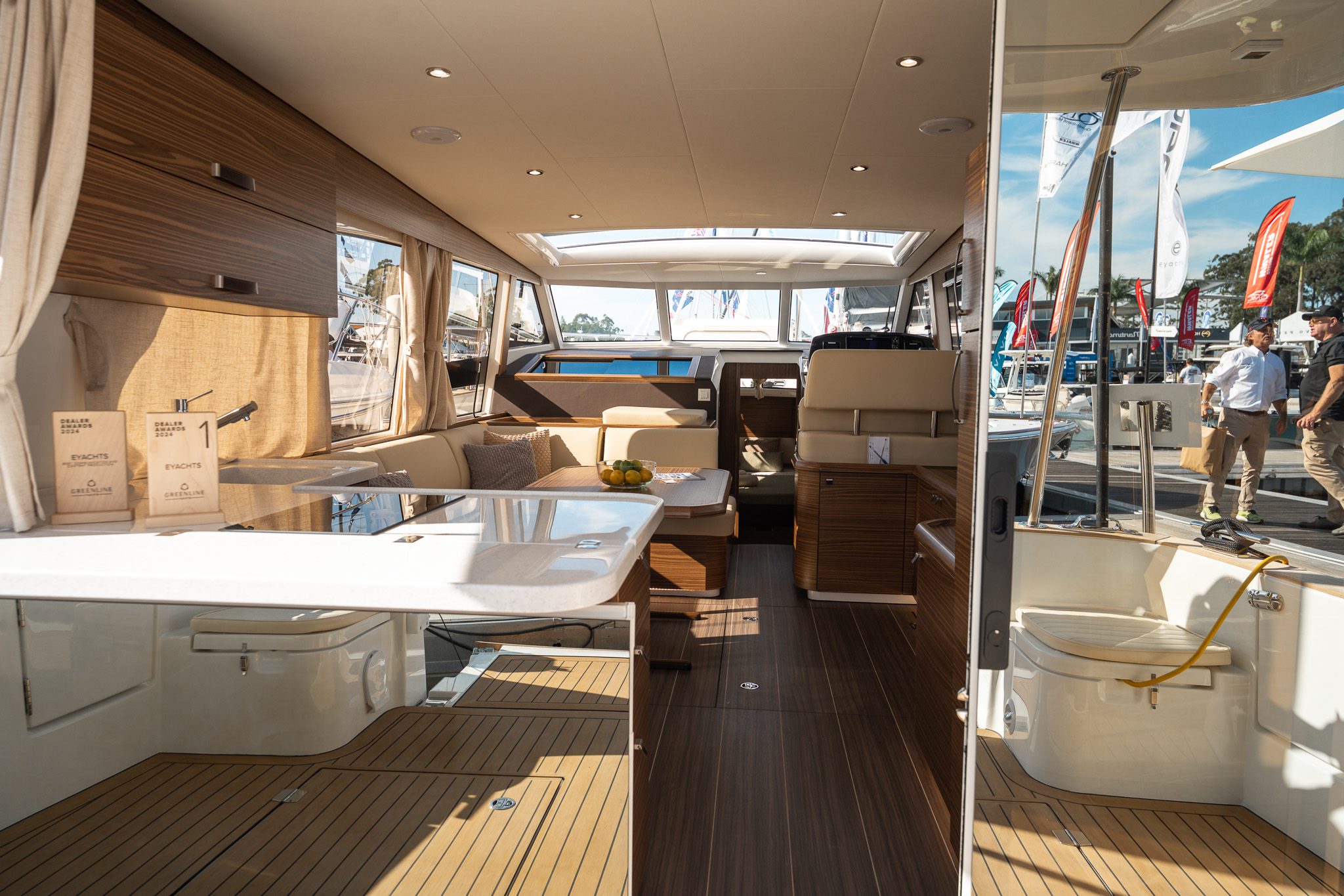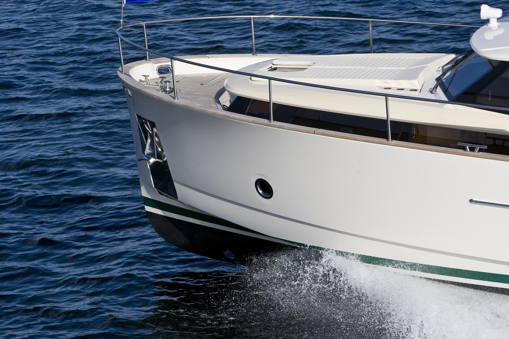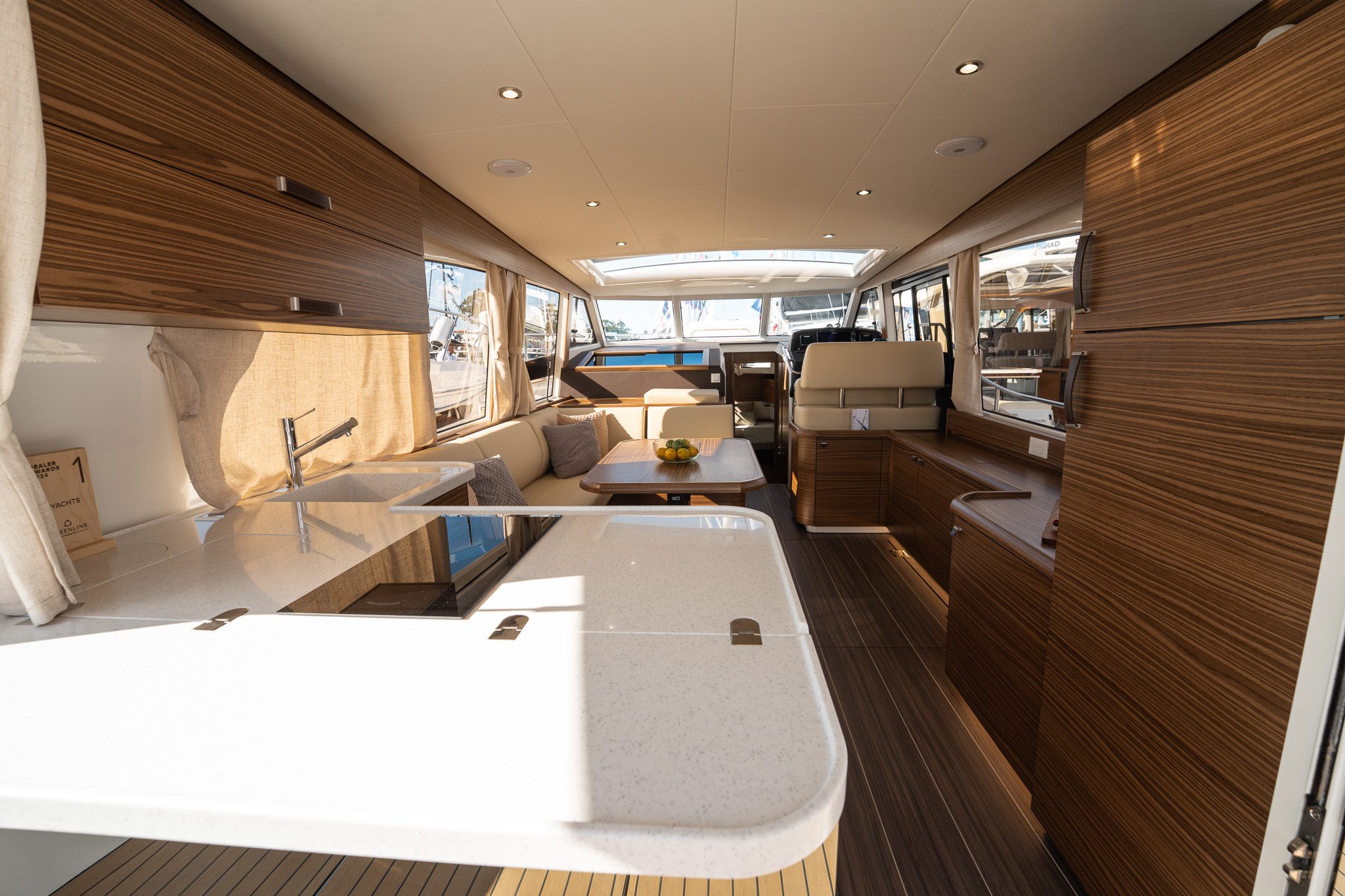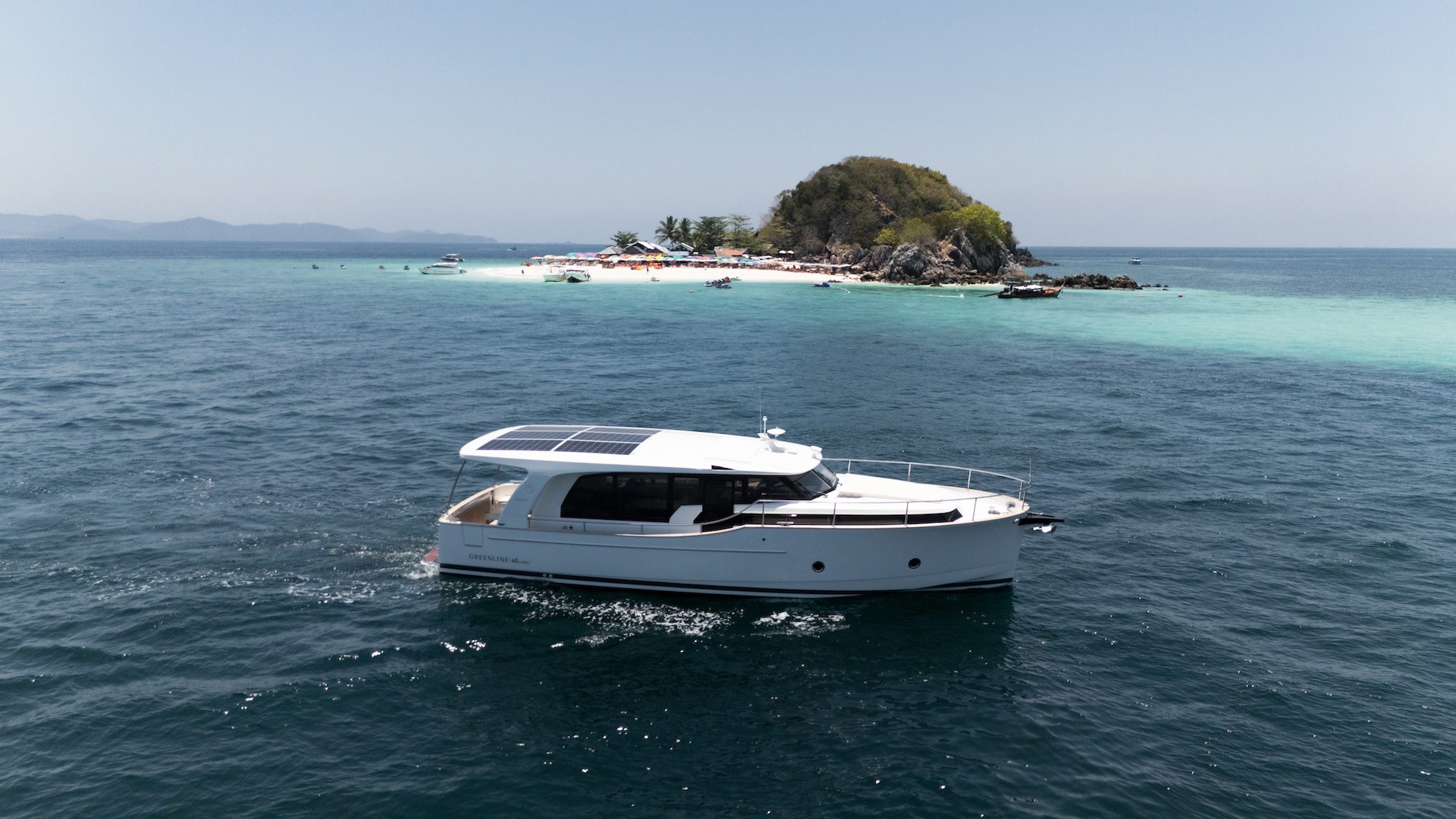 Greenline uses a hybrid system that lowers fuel use and lets you cruise or anchor on electric or solar power, giving quiet refinement. The 40 brings light sociable spaces with a clean modern vibe.