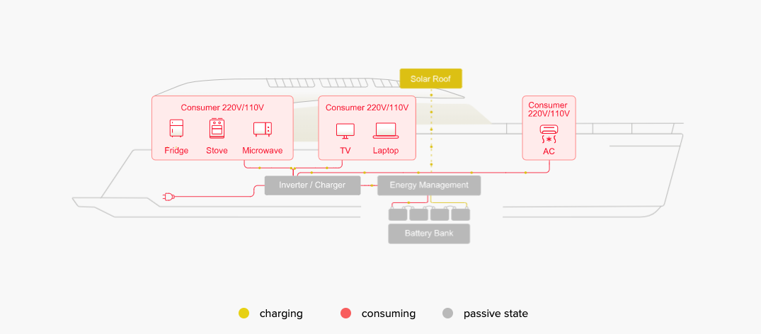 Greenline Yachts strives to offer an exceptional level of comfort on their boats. Their vessels are equipped with a solar panel bank, allowing users to operate all onboard appliances without the need for a generator or shore power. This not only eliminates noise and vibrations but also eliminates emissions, making it ideal for anchoring without disturbing nearby individuals. Additionally, Greenline Yachts utilizes high-performance LiPo batteries to power even high-load appliances such as air-conditioning in complete silence.