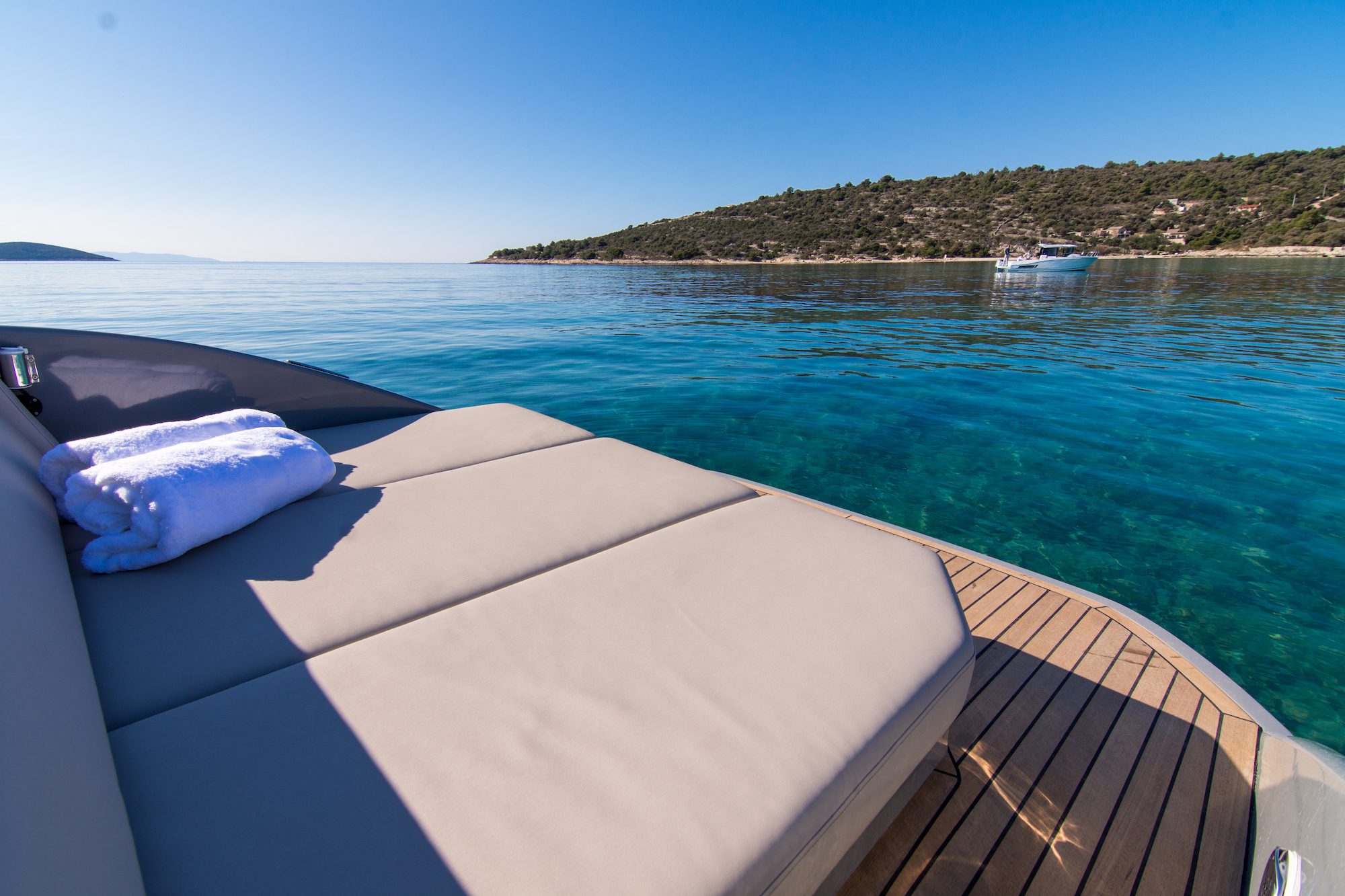 • Aft queen-size sunbed with space for three and stunning horizon views