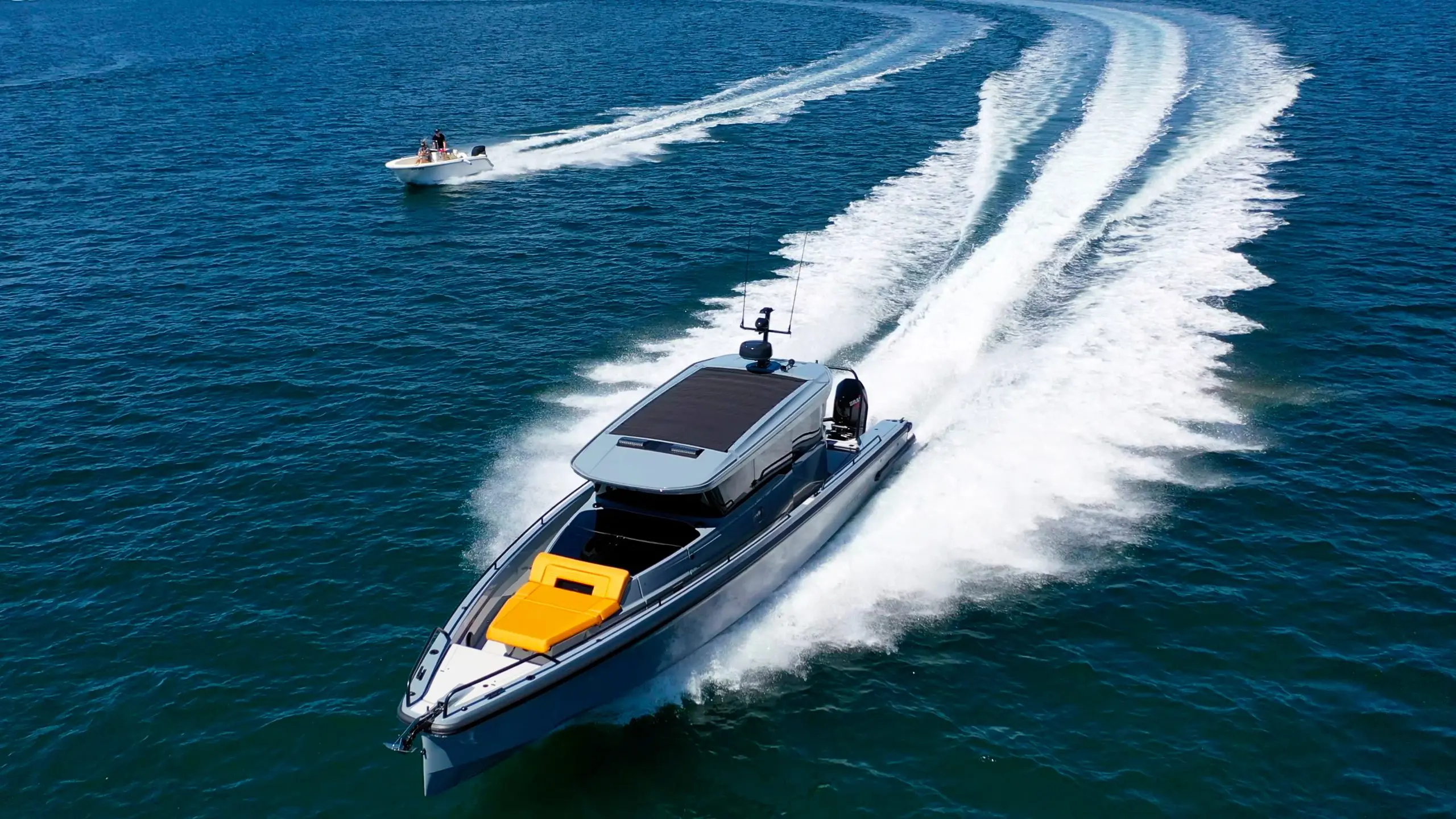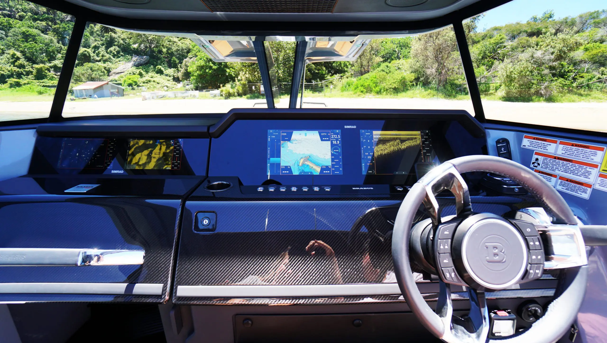 Joe Fox –The Brabus 900 is a one-of-a-kind boat to experience whether you are driving or a passenger alike. The handling is typical of the famous Axopar design yet, given the additional power and upgraded construction methods the boat is even more of a weapon. We put it through its paces with some tight turns at high speed. From 58 knots in a straight line, a 90 degree turn only pulled the speed down to 55 knots, in a fair amount of surface chop and the hull held perfectly through the turn with no loss of grip. Noise inside the cabin is minimal with little to no vibration at speed allowing for an easy softly spoken conversation. This is a dreamboat to drive and anyone who is lucky enough to experience it will be blown away – very cool”.