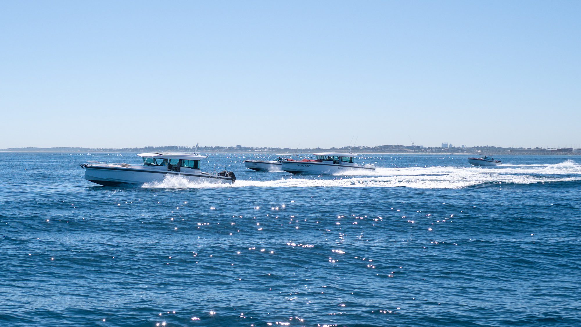 With the weather on our side, the crossing from Fremantle to Rottnest Island was nothing short of breathtaking. The ocean was glassy, allowing the range of Western Australia Axopar boats to glide effortlessly across the water, their engines humming in unison. The group made a valiant attempt to maintain a V formation for the drone shots, but as one of the skippers quipped, “Some people need to go back to school to discover what a V looks like.”