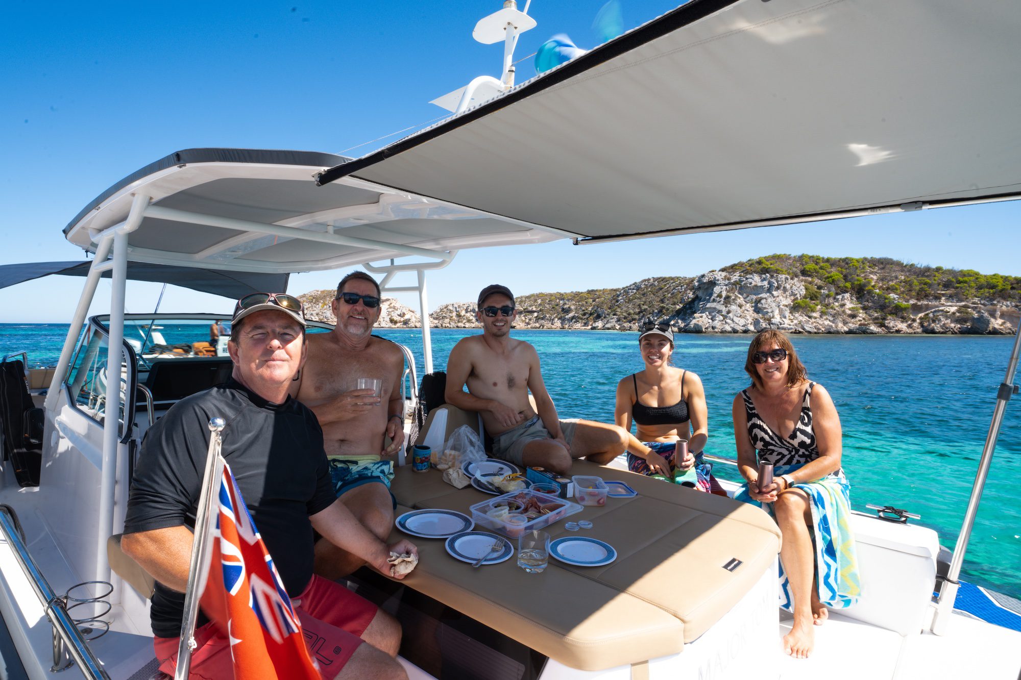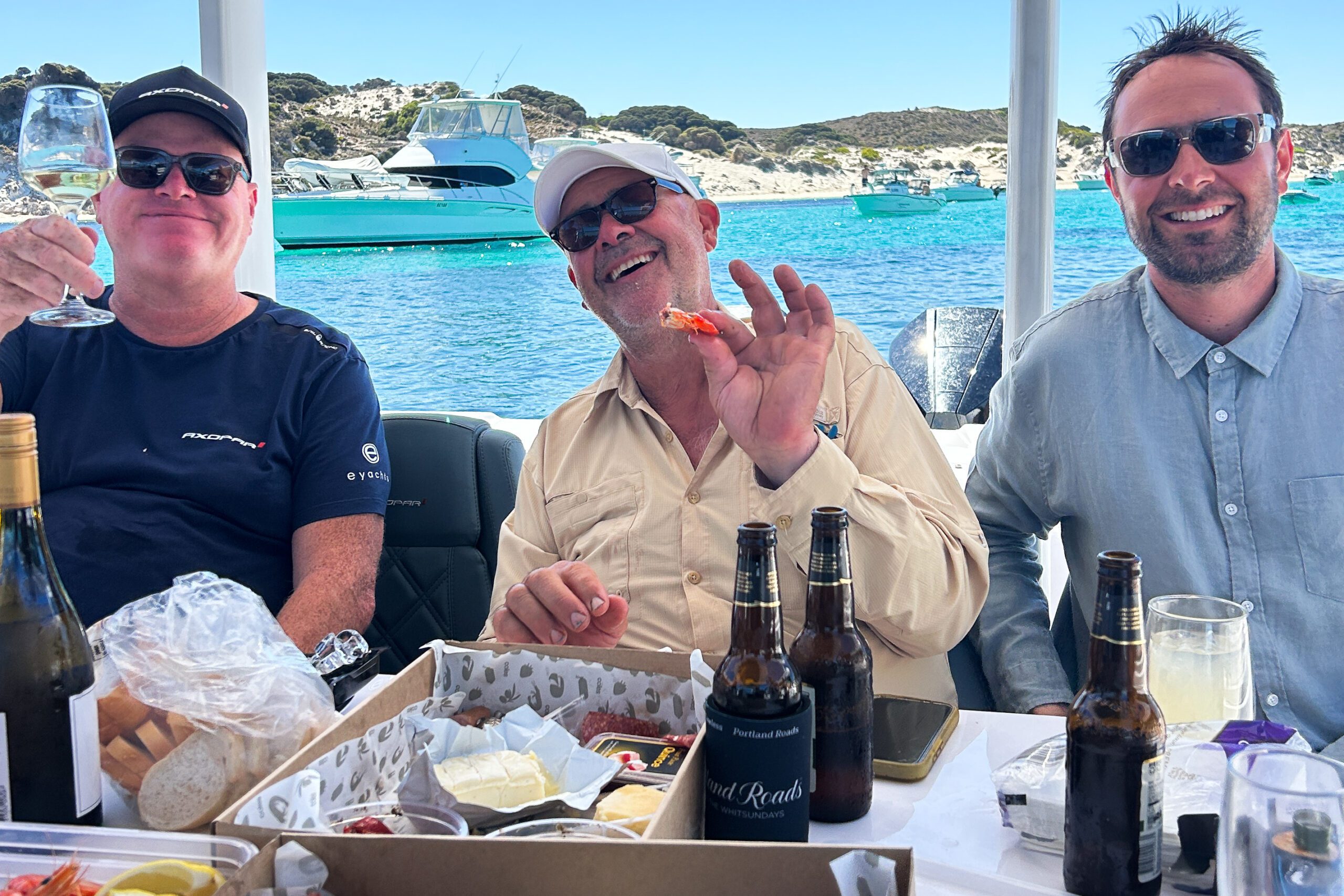 Arriving at Parker Point, Rottnest Island, a protected bay blessed with light sand shores and coral beds, the fleet rafted up, creating their own little floating village. With the temperature soaring to 35 degrees, it didn’t take long for everyone to set up awnings and dive into the refreshing water. The mood was light and the scenery unbeatable.